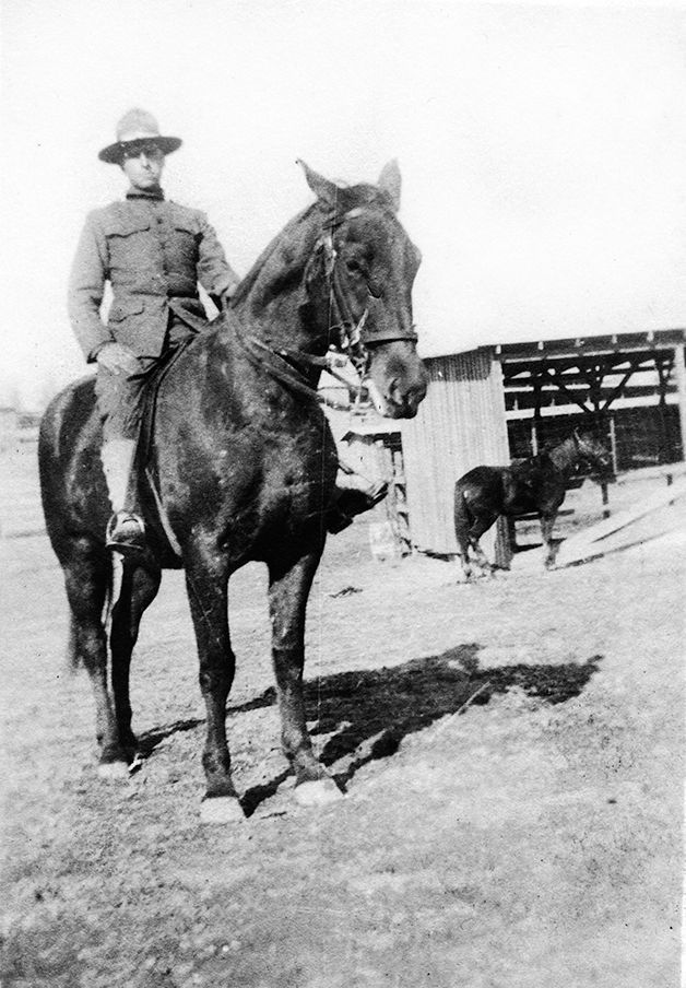 Print, photographic. Black & white, vertical view snapshot, 4.5" x 2.75", view of Mechanic William Frey, of Headquarters Co., 325th Infantry Regiment, 82nd Division, A.E.F., on horseback at Camp Gordon, Atlanta, written on reverse in black ink "William Frey", in pencil "325 - Infantry Camp Gordon Atlanta, Ga.", WWI.Acquisition