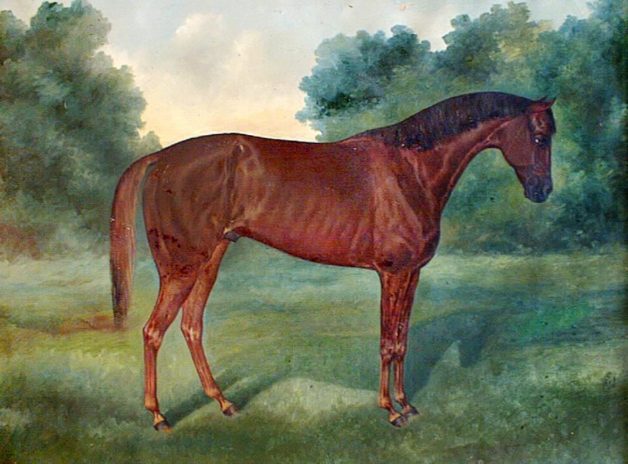 "The Friar" was one of the horses owned by Robert W. Walden at his Bowling Brook racing stables in Middleburg, Md. Mr. Walden was the grandfather of Thelma Walden Littlefield Shriner. Painting hung in the library at Hard Lodging. The majority of the paintings of horses from the Bowling Brook stables are in the collection of the Maryland Historical Society.