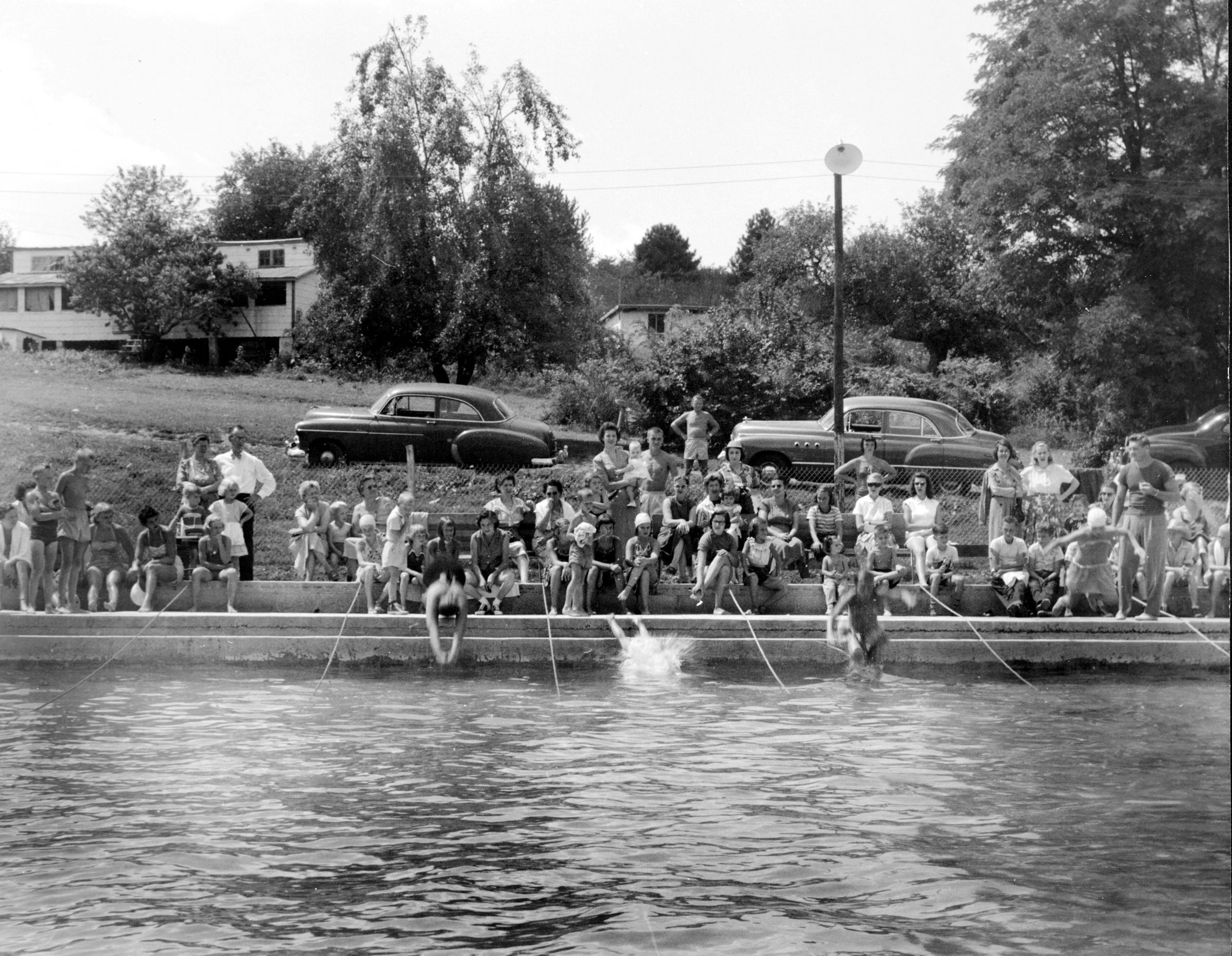 Print, photographic. B/W photo of the swimming pool at Frock's Sunnybrook Farm, 112 Bond Street, Westminster. Shows several children diving into the pool while other children and parents are watching from along the pool deck. 7.625" x 9.5".Acquisition