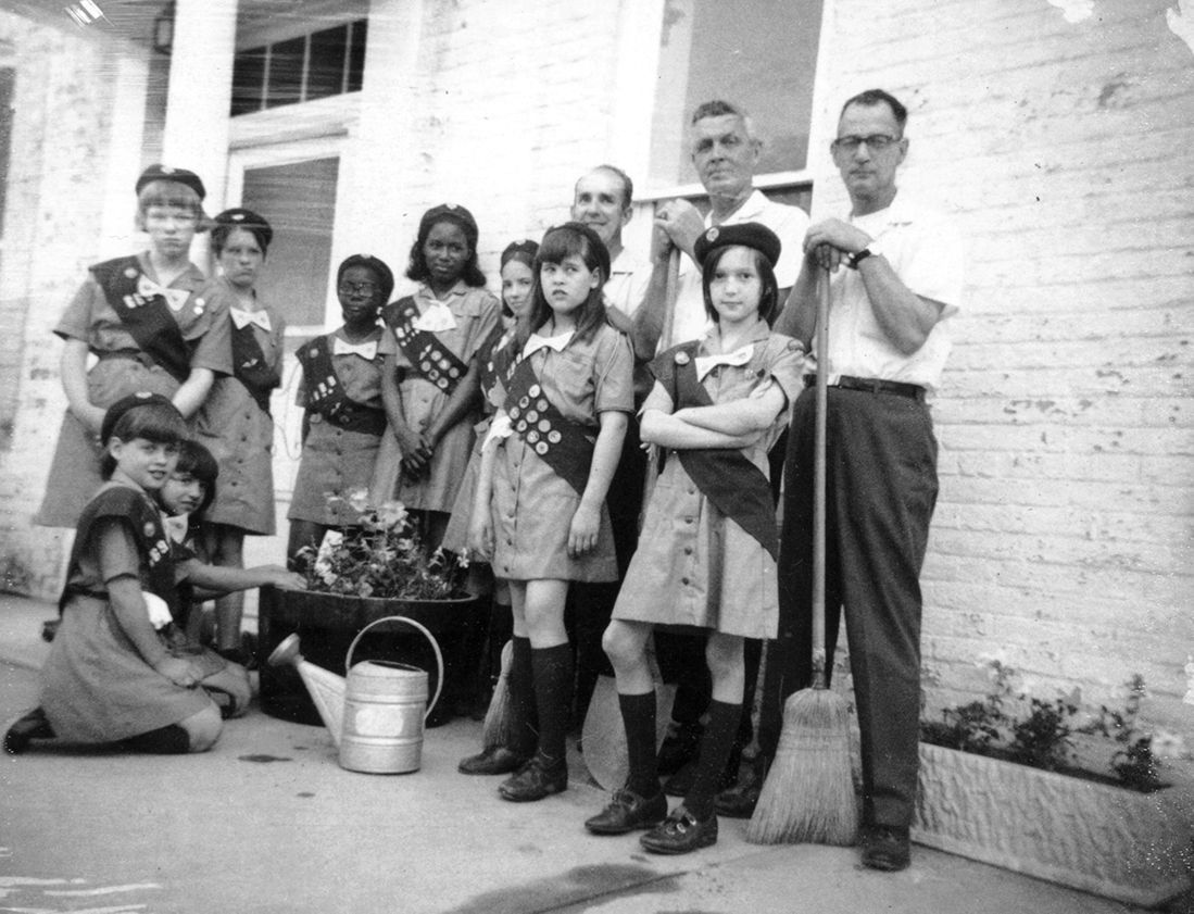 Print, photographic. Girl Scouts, Westminster,City Clean Up. B/W photo. The photo shows nine young girls in Girl Scout uniforms. Two of them are crouched around a large planting barrel into which they have all just been planting flowers, the others are standing around it, posing for the photo. There are three men standing behind them with shovels, posing as well. There is a window box that has been freshly planted as well to their right. There is a watering can sitting in front of the barrel planter. They are gathered out in front of a white brick building with a columned front door to the back left. 3.25" x 4.25"