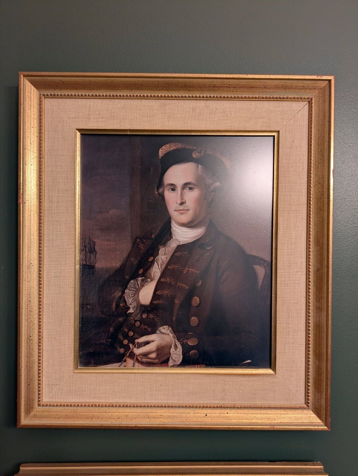 print, photographic. Color photograph of man (General Mordecai Gist) in colonial uniform with tri-corner hat. Label on back: "DAVID BENDANN'S FINE ART ROOMS 105 East Baltimore St. Baltimore. ESTABLISHED 1859 NUMBER 876." Rectangular wood frame, painted gold, with cream-colored fabric inner border. 17.75"h x 15.75"w x 1"d.Acquisition