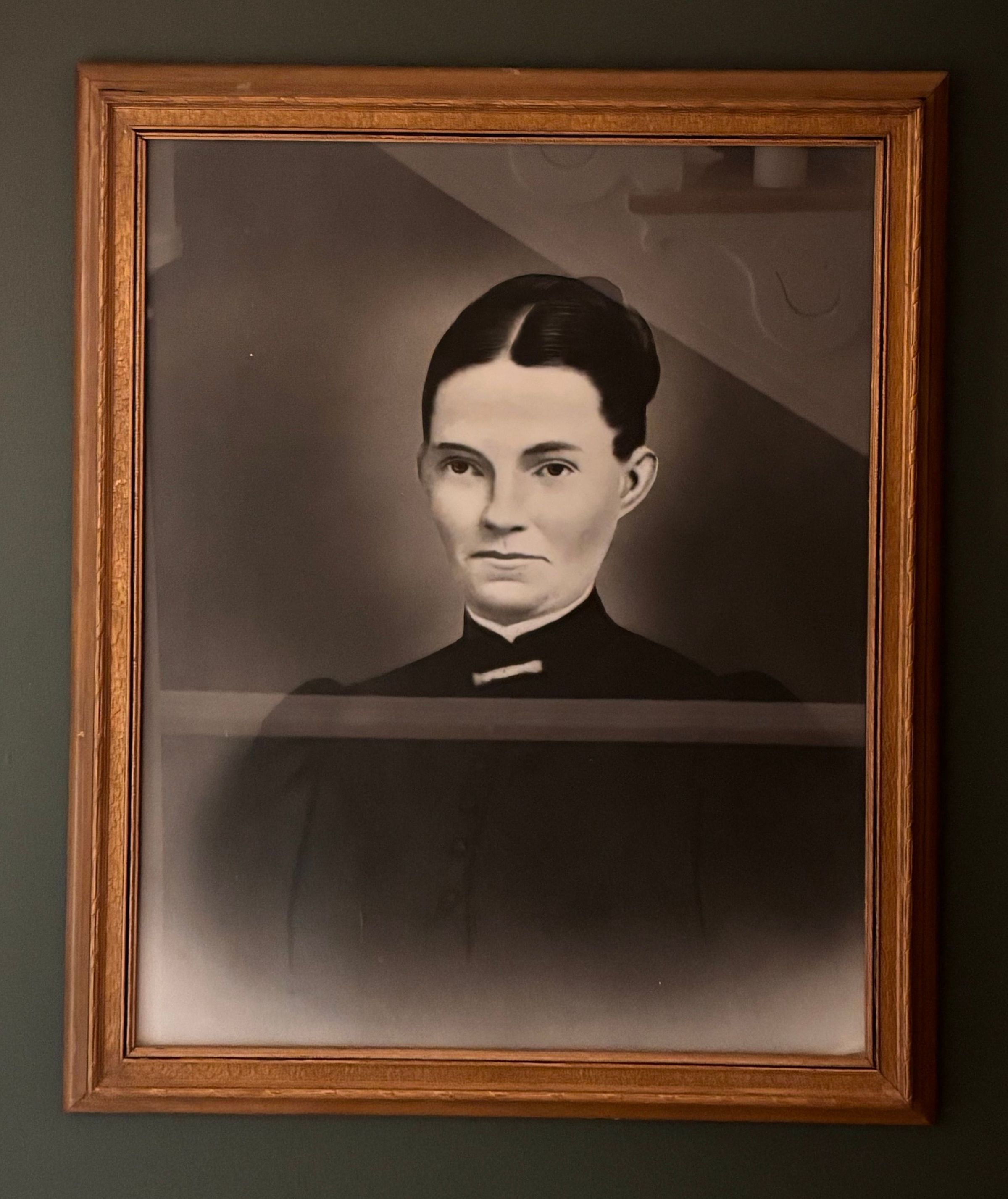 Print, photographic. A: B/W photograph of a drawing of Harriet Virginia Deeds Glover. Original image c.1890. 15.875" x 19.875". B: Frame; wood; painted gold; decorative border around center.Acquisition