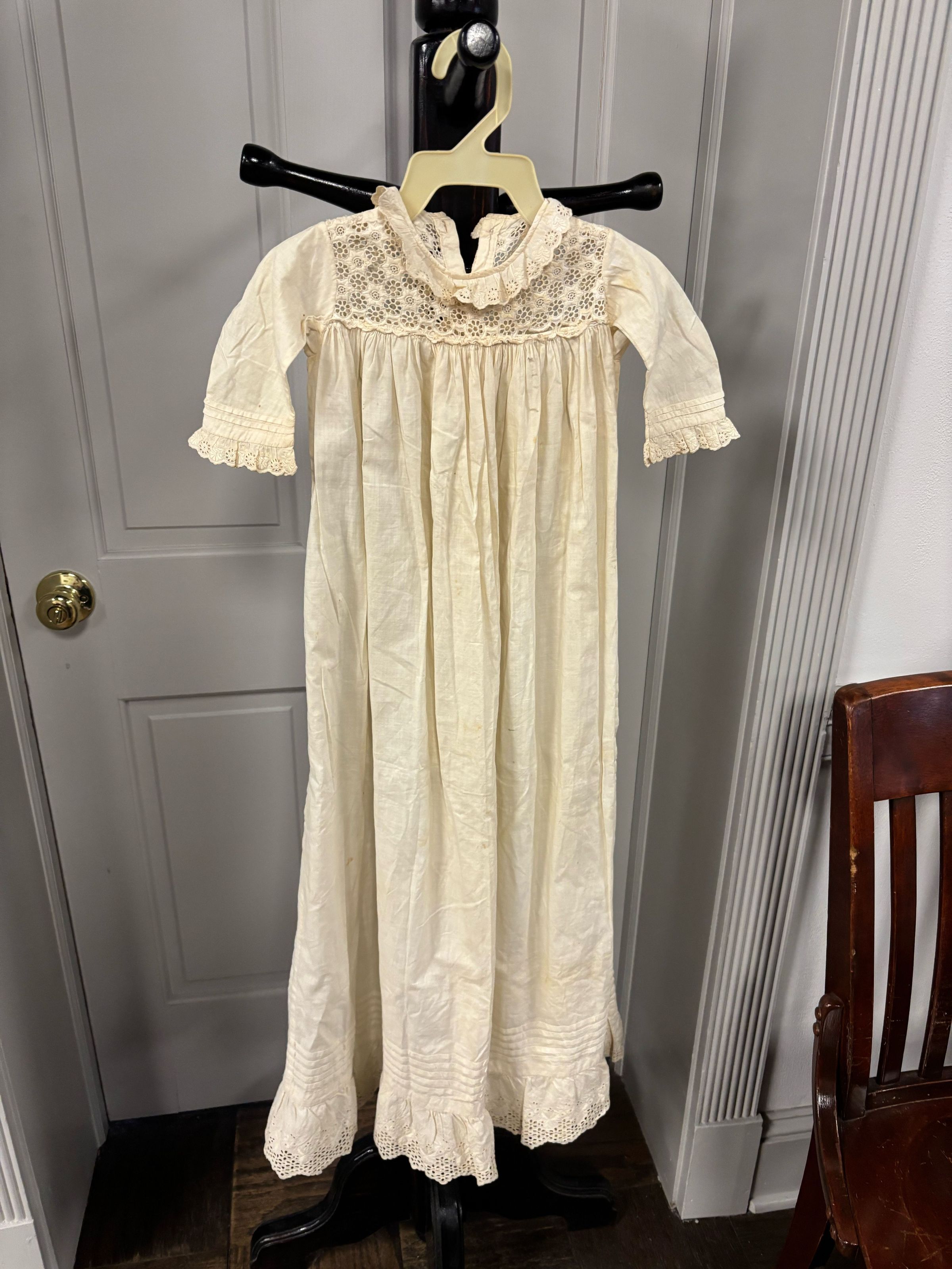 Gown, baptismal. Handsewn white linen christening gown, child sized. Oversized white linen skirt with long sleeves and commercial made white eyelet lace collar and ruffles on bottom hem of sleeves and gown. Back is open 11” from top of collar, with two small white shell buttons on collar to close it. Approx. 37” long. Sewn c. 1920.