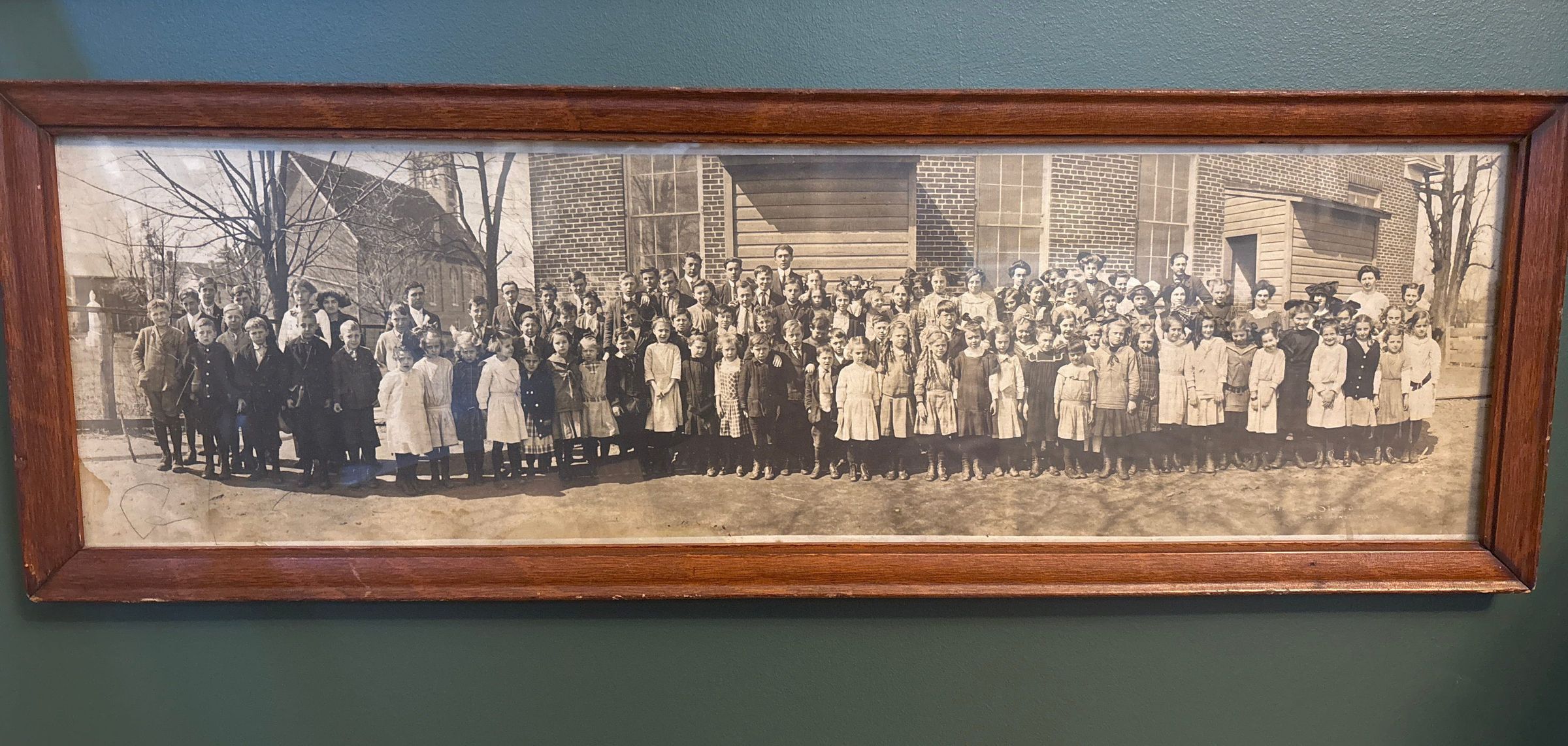 Photograph, framed. A panoramic b&w photograph of the students and faculty of Hampstead Elementary School taken circa 1910. Signed “The Lewis Studio- Westminster”.