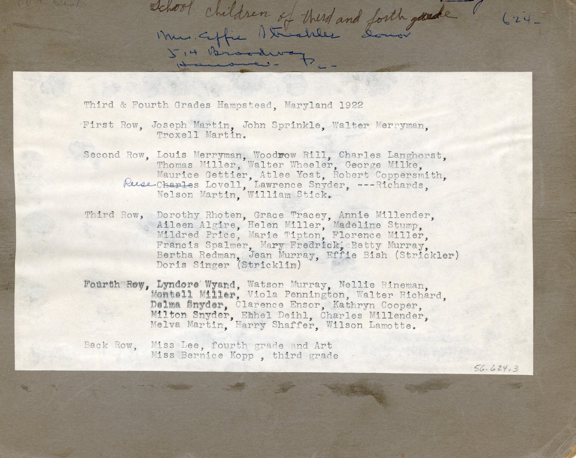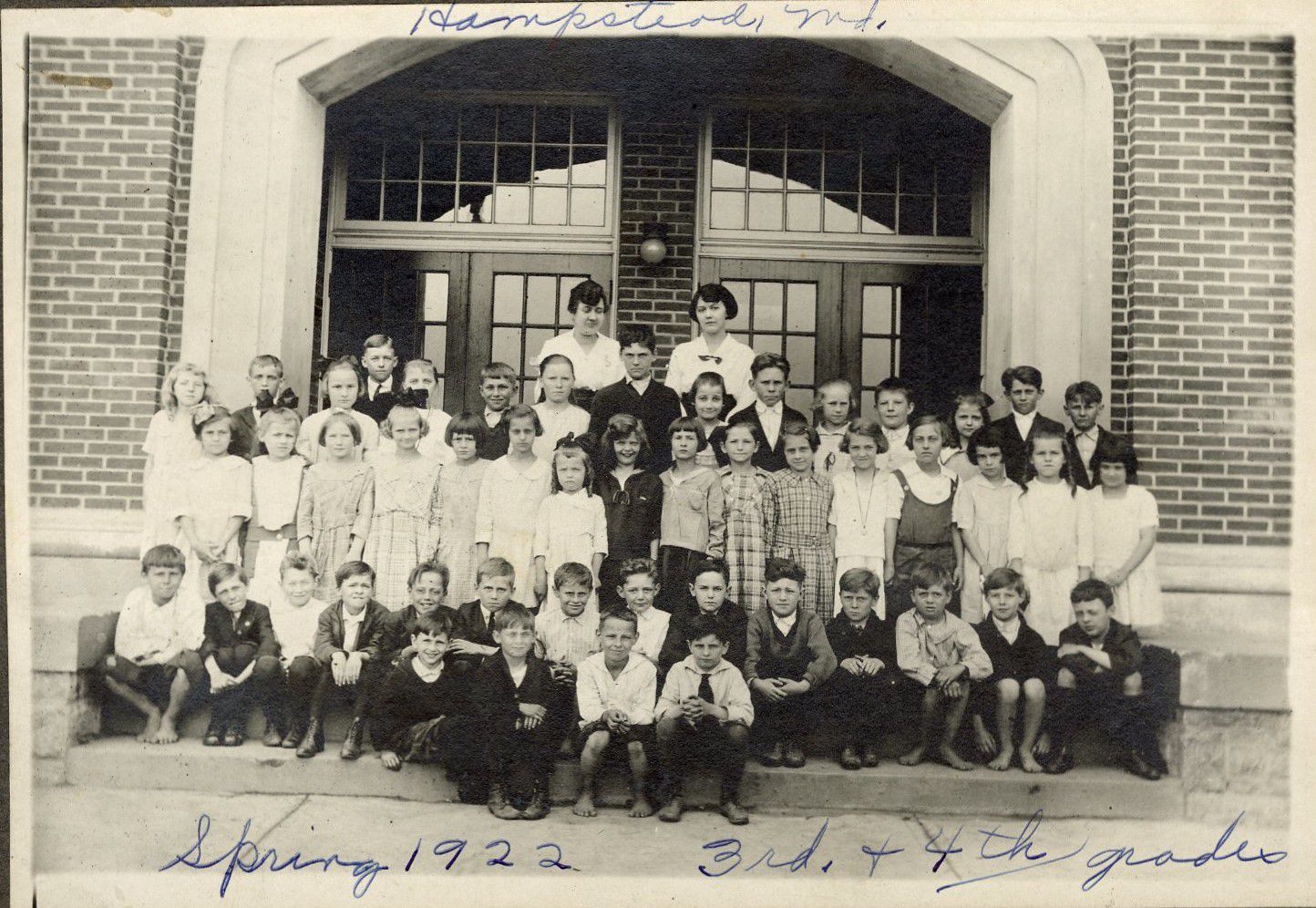 Print, photographic. B/W silver gelatin print. Shows the 3rd and 4th grade classes at Hampstead Elementary school, 1922. Written on front of photo: "Hampstead, MD, Spring 1922, 3rd and 4th grade." Written on back, top left corner: "Effie Bish. School Children of third and forth grade, Spring, 1922. Mrs. Effie Strickler, donor, 514 Broadway, Hanover, PA." Typed list of students in photo is glued to back. First Row: Joseph Martin, John Sprinkle, Walter Merryman, Troxell Martin. Second Row: Louis Merryman, Woodrow Rill, Charles Langhorst, Thomas Miller, Walter Wheeler, George Milke, Maurice Gettier, Atlee Yost, Robert Coppersmith, Reese Lovell, Lawrence Snyder, _____ Richards, Nelson Martin, William Strick. Third Row: Dorothy Rhoten, Grace Tracey, Annie Millender, Aileen Algire, Helen Miller, Madeline Stump, Mildred Price, Marie Tipton, Florence Miller, Francis Spalmer, Mary Fredrick, Betty Murray, Bertha Redman, Jean Murray, Effie Bish (Strickler), Doris Singer (Stricklin). Fourth Row: Lyndore Wyand, Watson Murray, Nellie Rineman, Montell Miller, Viola Pennington, Walter Richard, Delma Snyder, Clarence Ensor, Kathryn Cooper, Milton Snyder, Ethel Deihl, Charles Millender, Melva Martin, Harry Shaffer, Wilson Lamotte. Back Row: Miss Lee, fourth grade and art, Miss Bernice Kopp, third grade. Mounted on dark gray board. Overall size: 8" x 10". Image size: 5" x 7.25"Acquisition