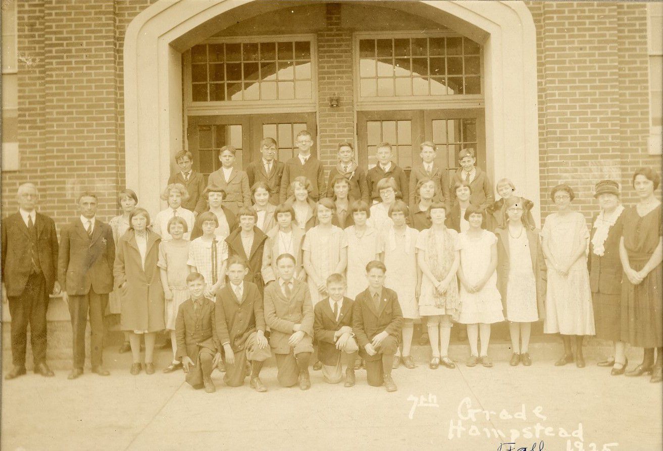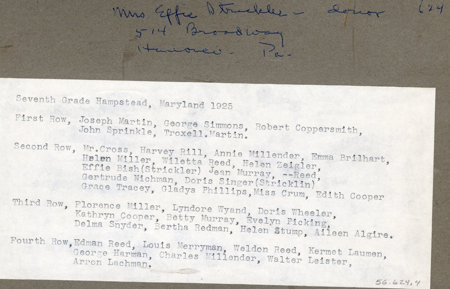 Print, photographic. B/W silver gelatin print, mounted on mat board with a window mat. Shows the 7th grade class at Hampstead Elementary school, 1925. 3 rows of students in front of the doors of the school. Written on front of photo: "7th Grade, Hampstead, Fall 1925." Written on Back of photo: "Mrs. Effie Strickler listed as donor, 514 Broadway, Hanover, PA." Typed list of students glued on back. First Row: Joseph Martin, George Simmons, Robert Coppersmith, John Sprinkle, Troxell Martin. Second Row: Mr. Cross, Harvey Rill, Annie Millender, Emma Brilhart, Helen Miller, Wiletta Reed, Helen Zeigler, Effie Bish (Strickler), Jean Murray, ____ Reed, Gertrude Nichman, Doris Singer (Stricklin), Grace Tracey, Gladys Phillips, Miss Crum, Edith Cooper. Third Row: Florence Miller, Lyndore Wyand, Doris Wheeler, Kathryn Cooper, Betty Murray, Evelyn Picking, Delma Snyder, Bertha Redman, Helen Stump, Aileen Algire. Fourth Row: Edman Reed, Louis Merryman, Weldon Reed, Kermet Lauman, George Harmon, Charles Millendar, Walter Leister, Arron Lachman. Overall size: 7.75" x 9.75". Image is approximately 5" x 7".Acquisition