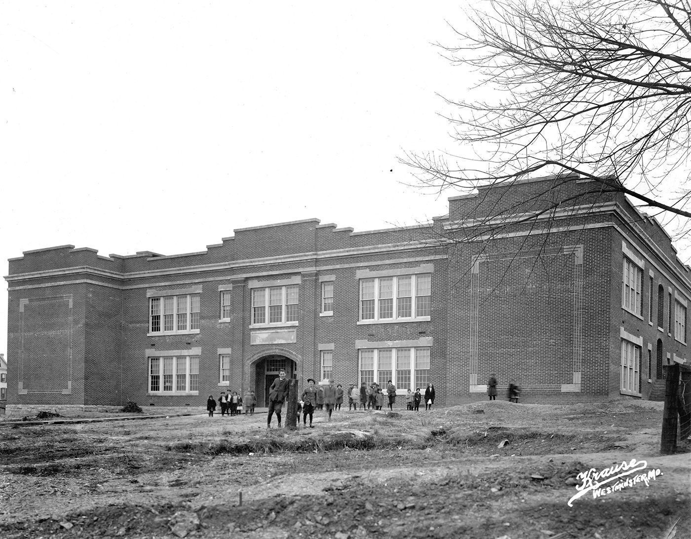 Print, photographic. Hampstead School. 2 story, brick structure. Students standing various places in front. Glimpse of house - lower left side of photo. Written on front of photo: "The Hampstead School Building." Photographers seal on front of photo - "Krause, Westminster, MD." 8" x 10".Acquisition