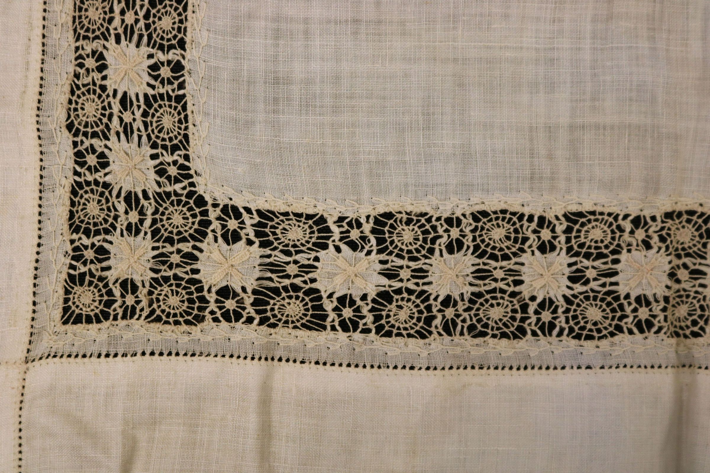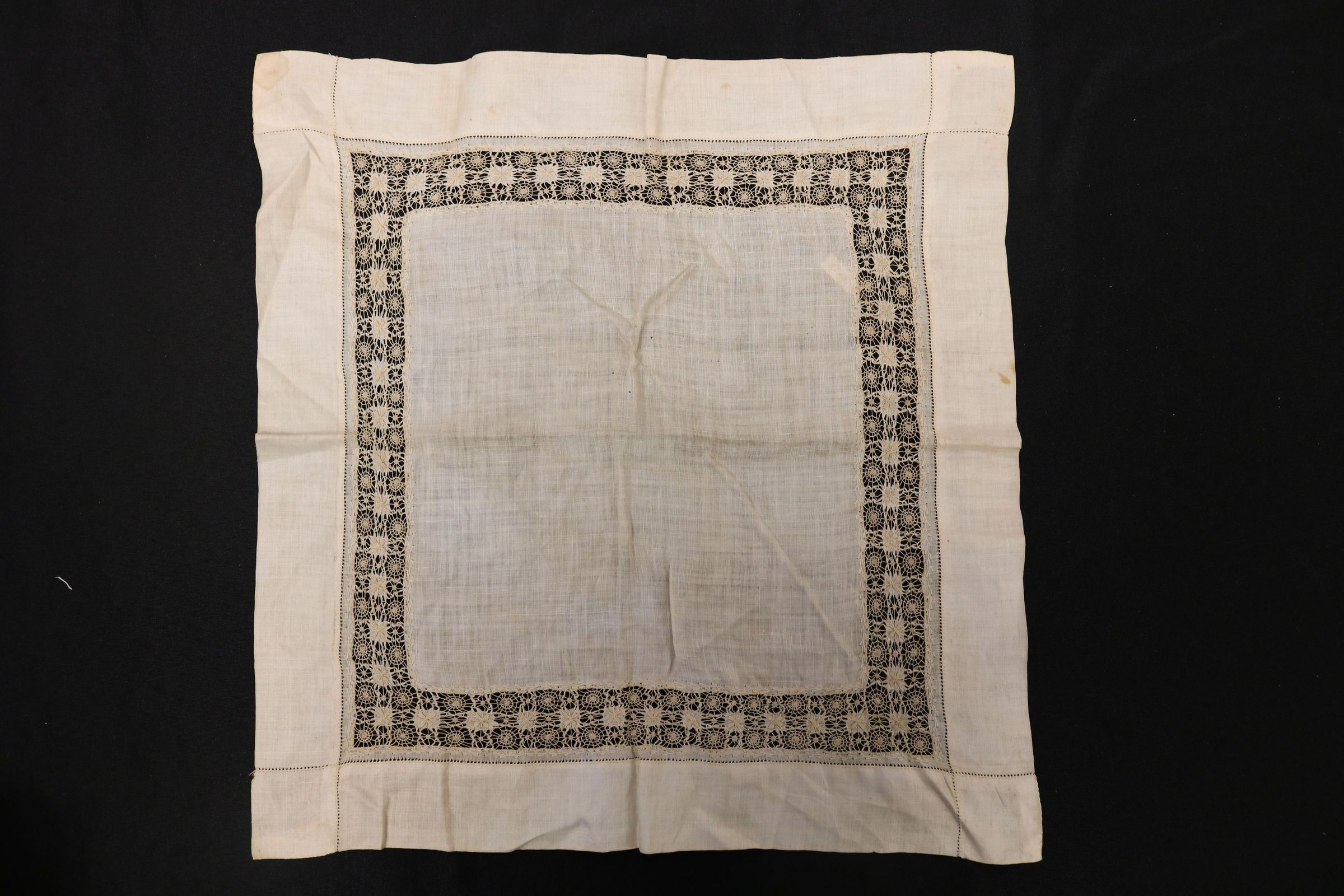 Original deed of gift reads "Drawn work (handks) by Miss M. Shellman.