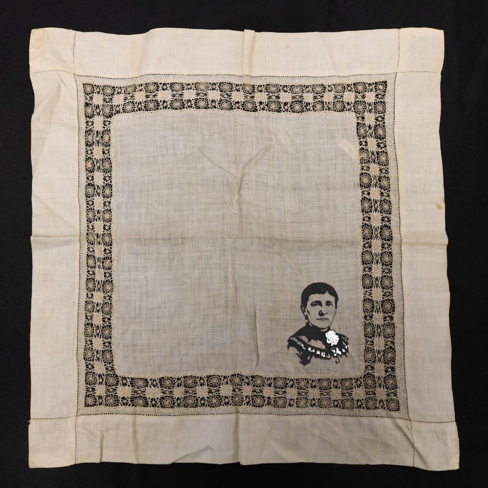 Handkerchief. Drawnwork handkerchief, made by Mary Bostwick Shellman. c.1900. White square with open design border.Acquisition