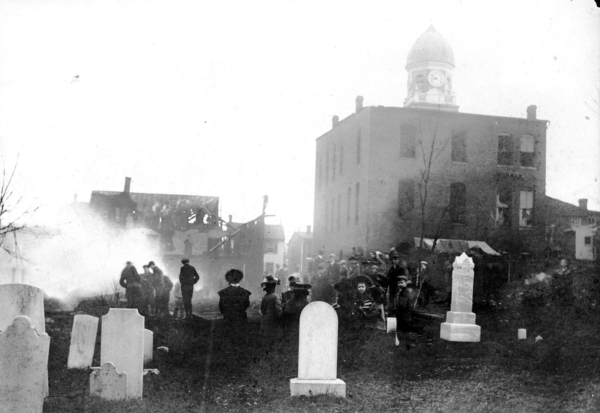 Henry H. Harbaugh’s business—the Palace Livery Stable—and home were next door to the Westminster firehouse on East Main Street. A fire of unknown origin erupted there on April 6, 1906. The blaze was reported just before 3:00 a.m. by a pedestrian on Green Street. The fire began at the back of the building and swept through the frame structure so rapidly that Harbaugh, his wife, and their three sons barely escaped, fleeing the building barefoot and in their nightclothes. Harbaugh’s losses amounted to over $18,000 and included 45 vehicles, harness, household goods and furniture, clothing, and 22 horses. The intense heat of the fire ignited the window frames of the firehouse and eventually spread to the interior of that building. The firehouse was saved but suffered extensive damage to the department’s meeting room, banquet room, and library. Also damaged were the city council chamber and clerk’s office that were located in the building. Burning embers carried on the wind to the roofs of nearby houses and residents used hoses and buckets to extinguish them and keep the fire from spreading. The firehouse was repaired and Harbaugh rebuilt, this time a fireproof building.