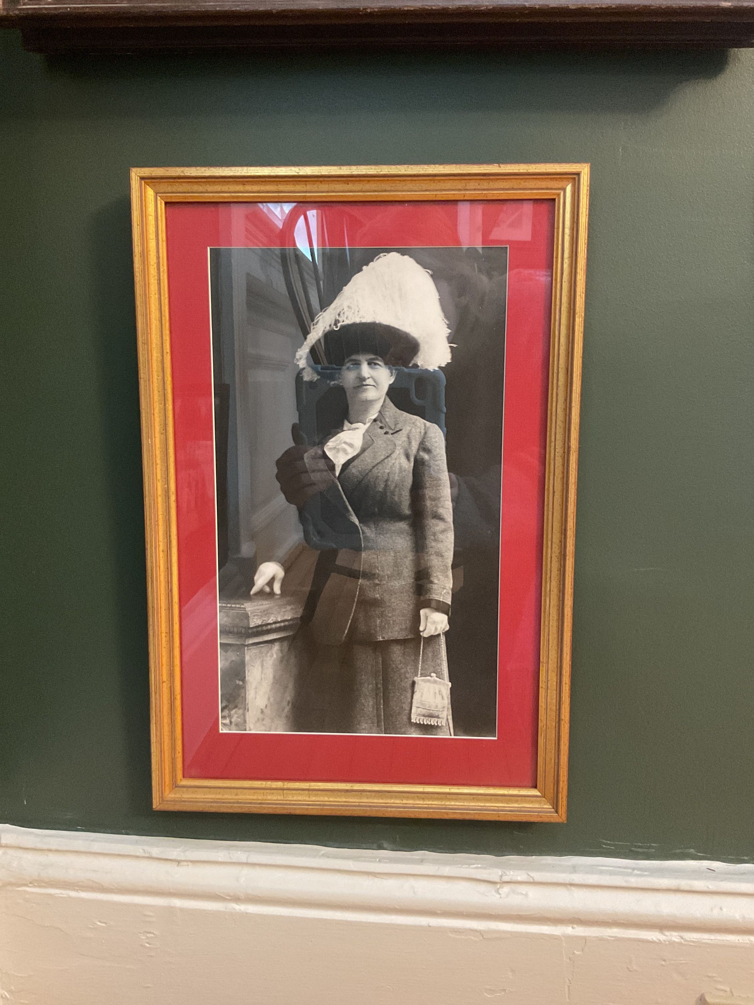 Print, photographic, black and white fiber-based copy of original that dated c. 1900, ¾ length portrait of standing woman, Annie Harner, large feather hat on her head, and a purse in her left hand. c.1990. Framed in gilt wood frame, with red matboard. Stamped on back: "FINE ARTS FRAMERS, INC. Conservation Framing 4022 N. 18th Road Arlington VA 22207 703-243-5208." Written in pencil "12 - 93 Aunt Annie Harner." 17.25"h x 11.375"w x .875"d. 1993Acquisition