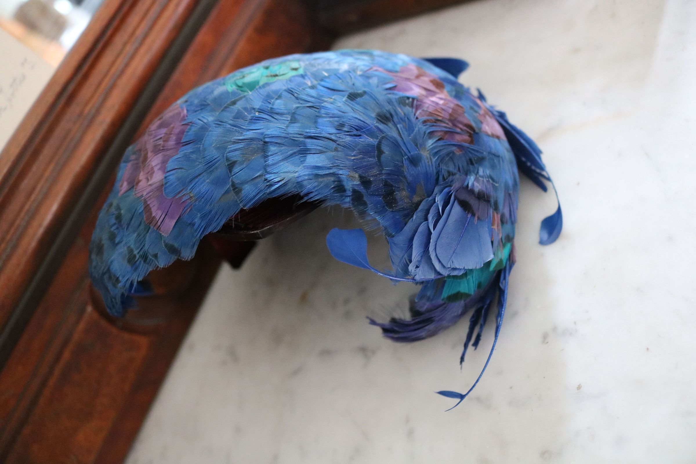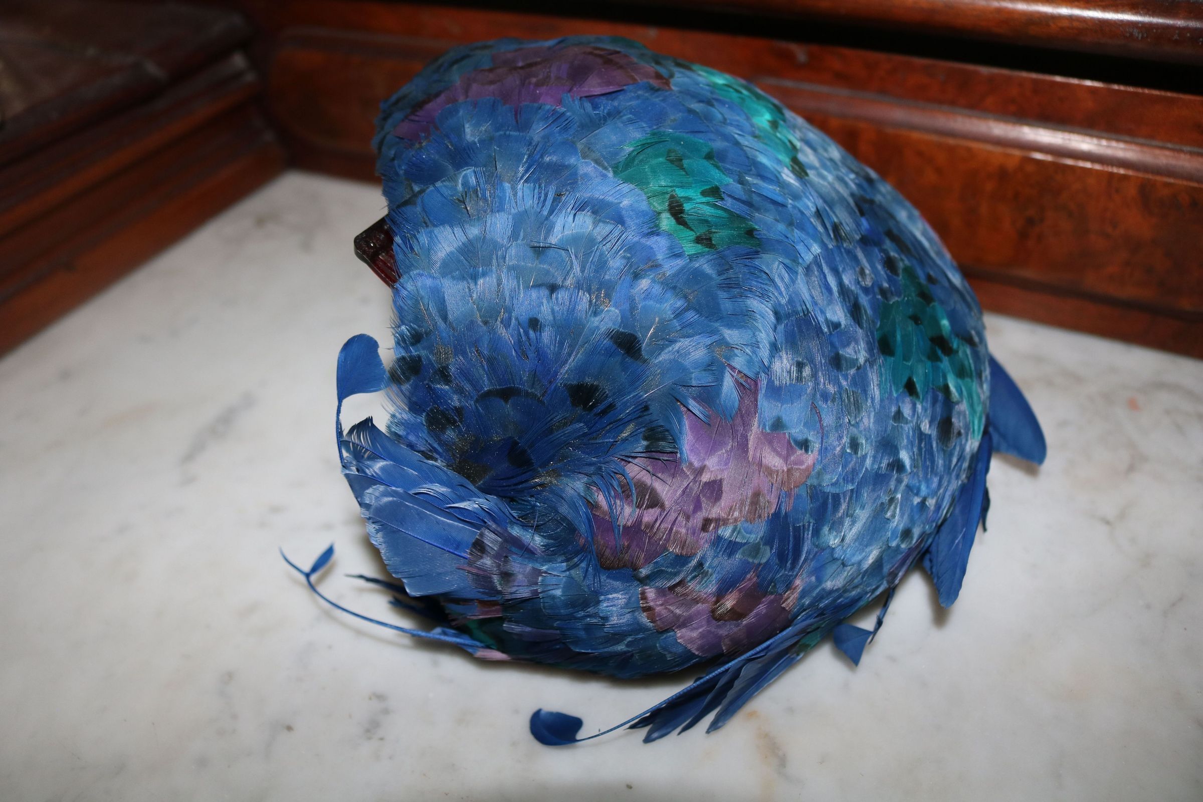 Ladies, triangular, covered with blue/green/purple peacock feathers.