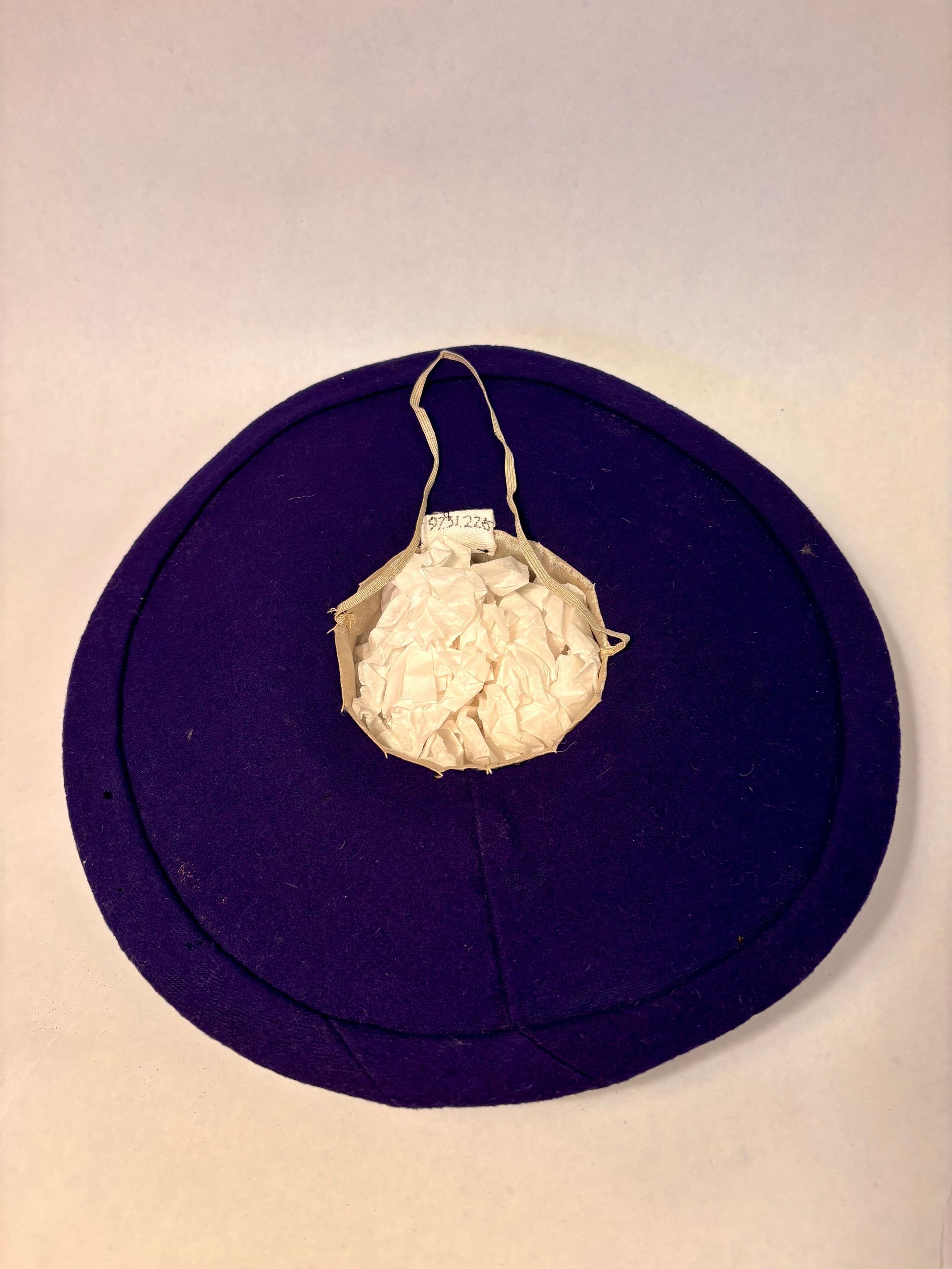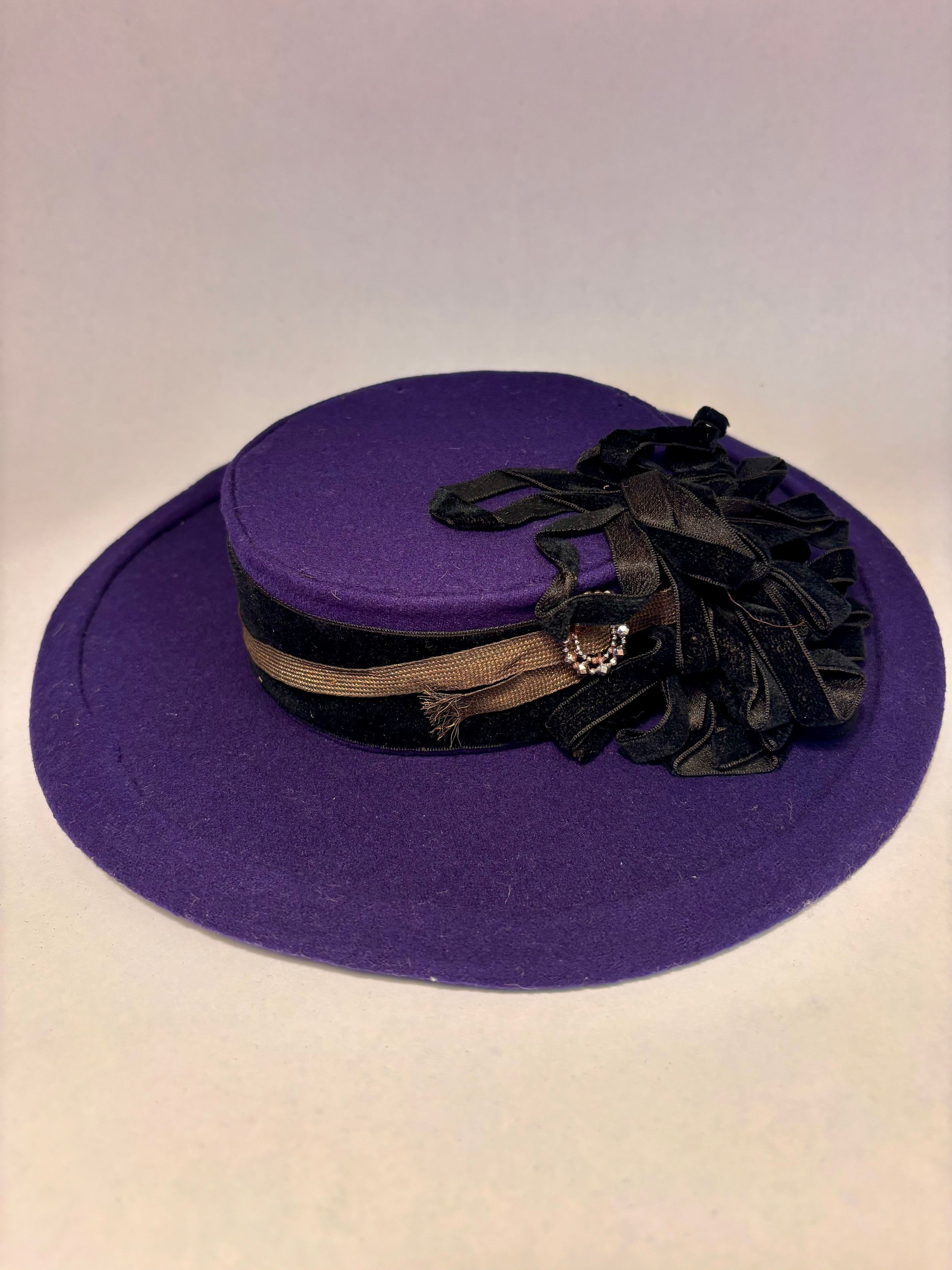 Hat. 10.5" diameter; dark purple wool; low crown with wide brim; black velvet band and looped bow; woven gold metallic ribbon and cut steel-like decoration; white silk lining. Cotton foundation stamped in gold "Miller Bros. Co. Dry Good & Millinery Westminster, Md." C.1910.Acquisition