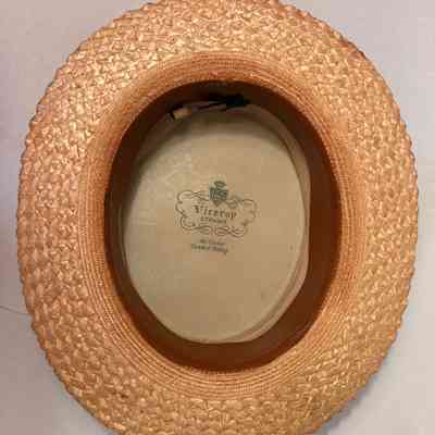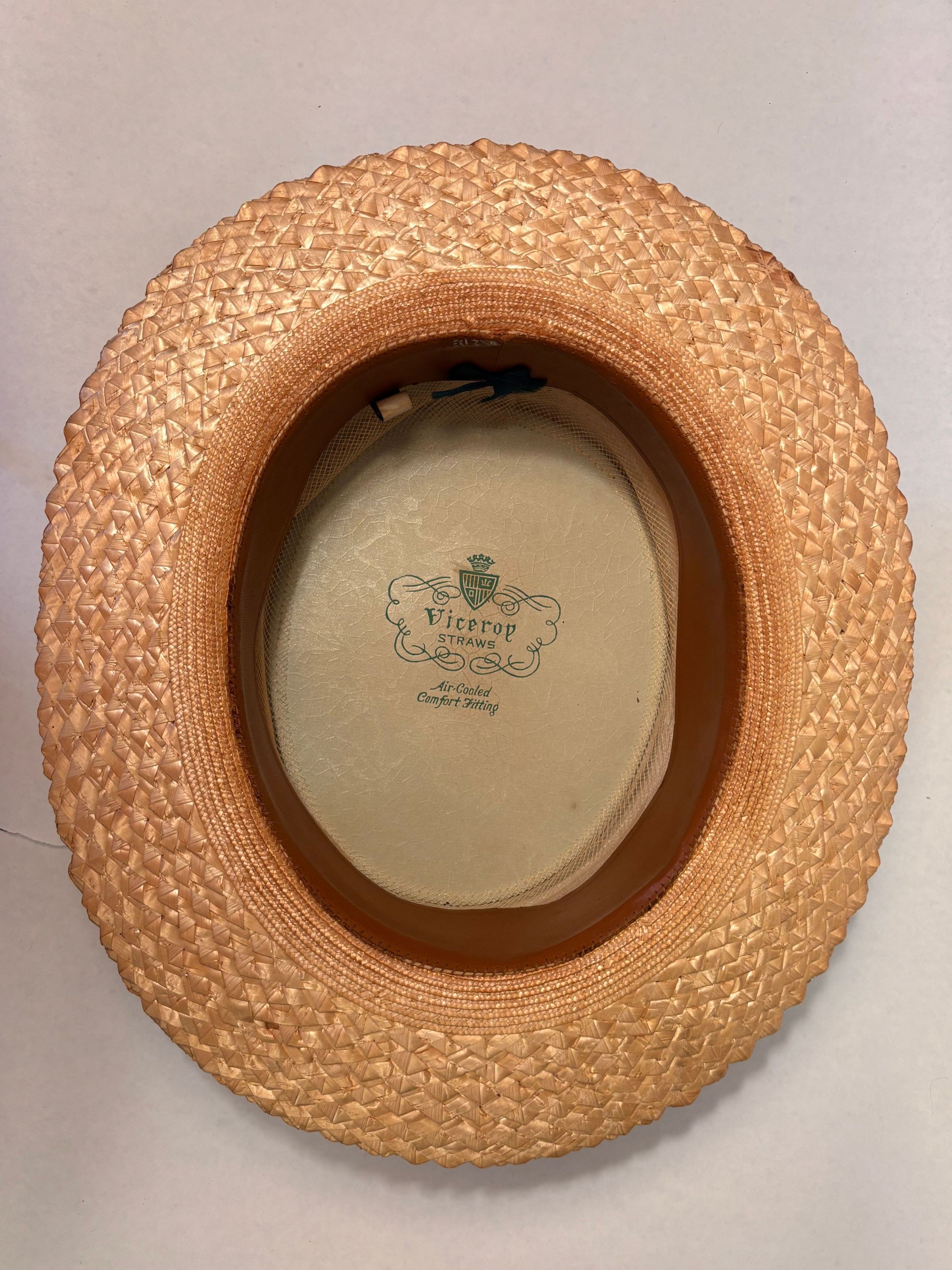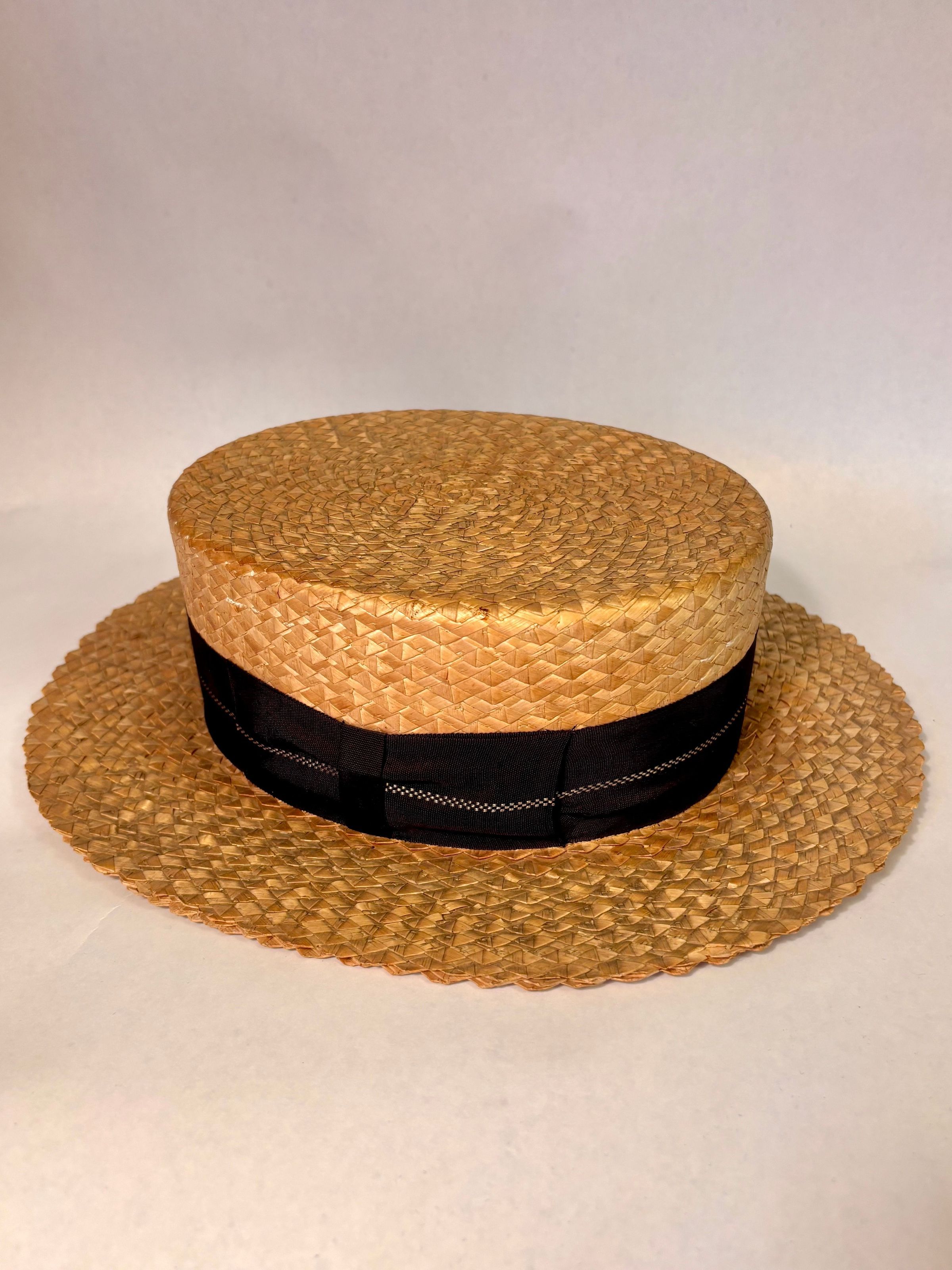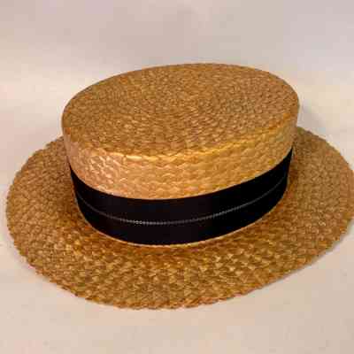 Hat. Man's straw boater, with black band, size 7. Worn by Malcolm Rakestraw and manufactured by Viceroy Straws, 1920 -1925.Acquisition