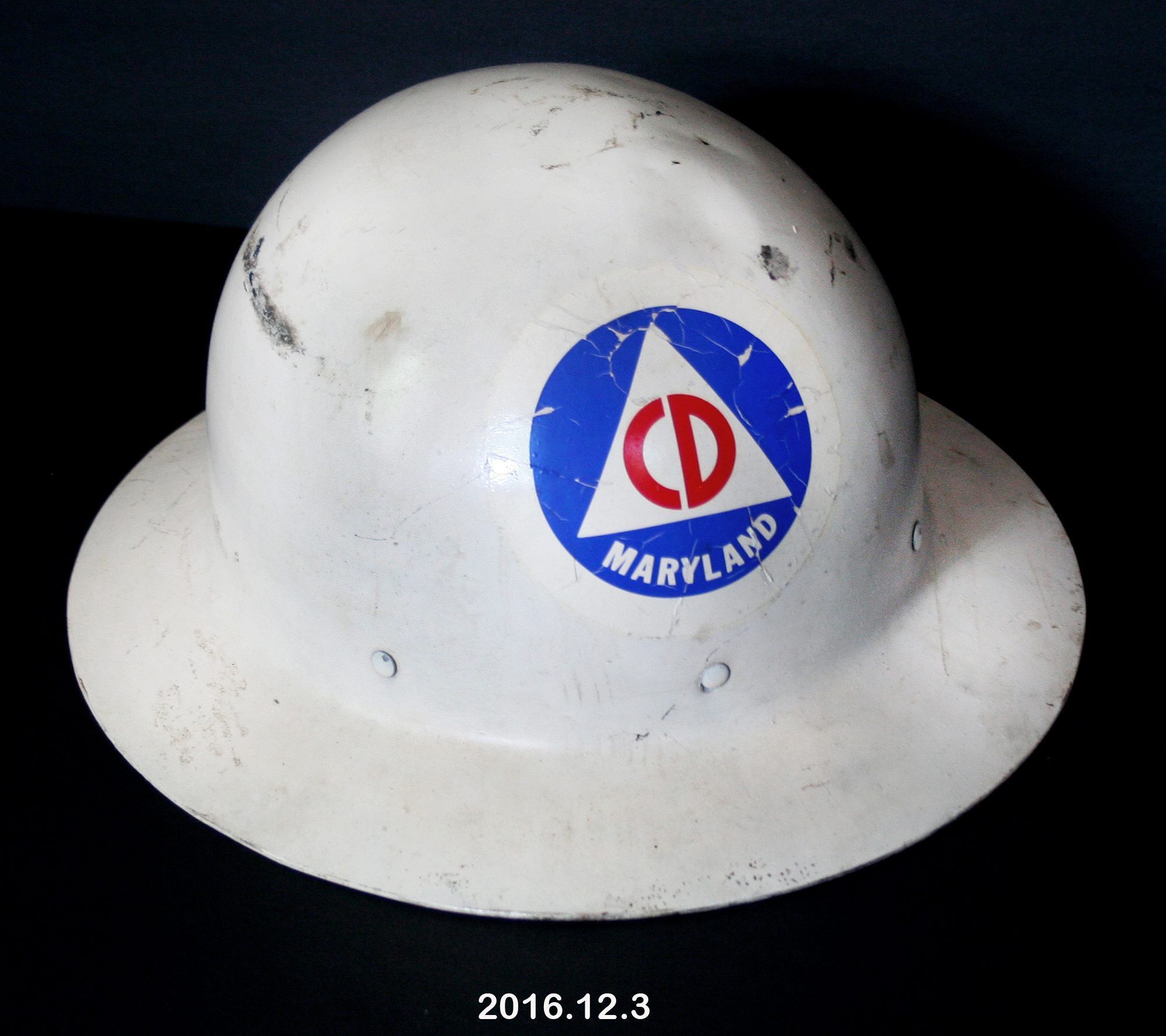 Helmet. Maryland Civil Defense. Steel, white; high domed crown with 2” brim; web of cotton straps inside allows for size adjustment; Civil Defense sticker on front is blue circle with white triangle at center; CD in red at center of triangle; “MARYLAND” in white below triangle. Stamped on underside of brim at back "U.S. GOVT PROPERTY O C D". 6” x 11.75” x 13”.Acquisition