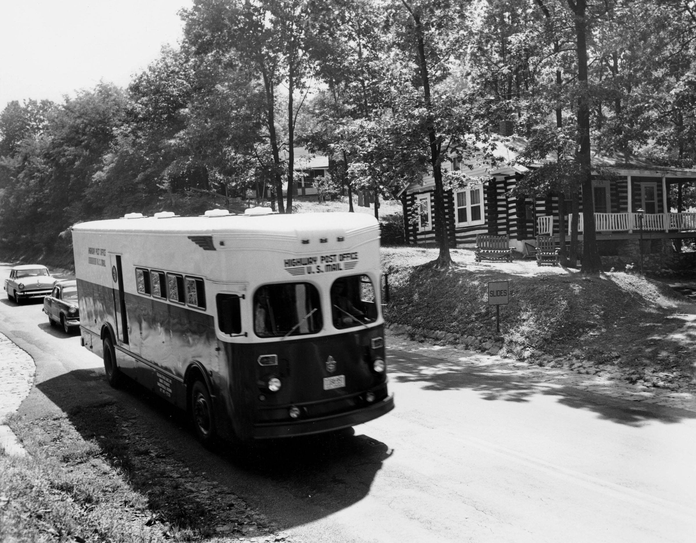 Print, photographic. B/W photo of a Highway Post Office bus, Baltimore to Martinsburg, parked on a suburban street. Written on back: "Mrs Paul Wimert POST OFFICE DEPARTMENT UNITED STATES OF AMERICA AUG 20 1955". 7" x 9".Acquisition