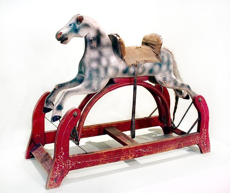 Horse, rocking. Wooden horse, painted white with black dappling, horsehair tail, cloth seat, leather stirrup. Horse is attached to wooden arch. Metal rods connect the bottom of each arch to a wood platform. Platform is painted red. 26"h x 12.5"w x 35"d.Acquisition