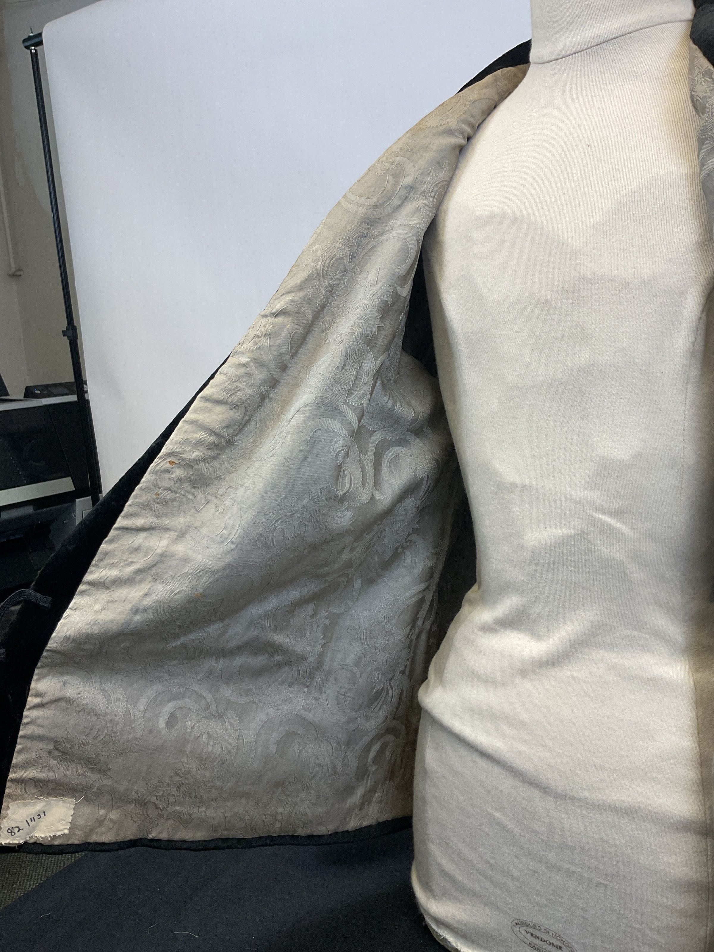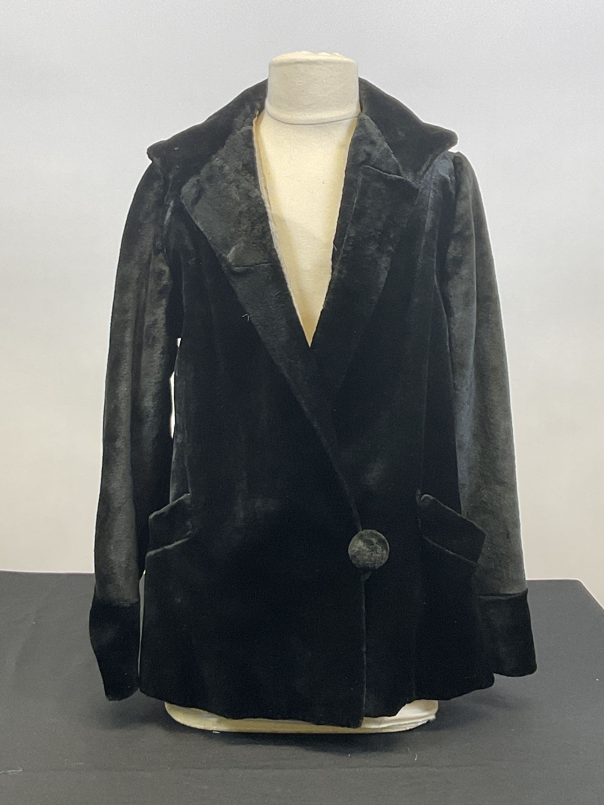 Jacket. Black velveteen, gray brocade lining, two pockets, one large button. 27" x 12". Original deed of gift reads "a black jacket worn by Miss Mary B. Shellman"Acquisition