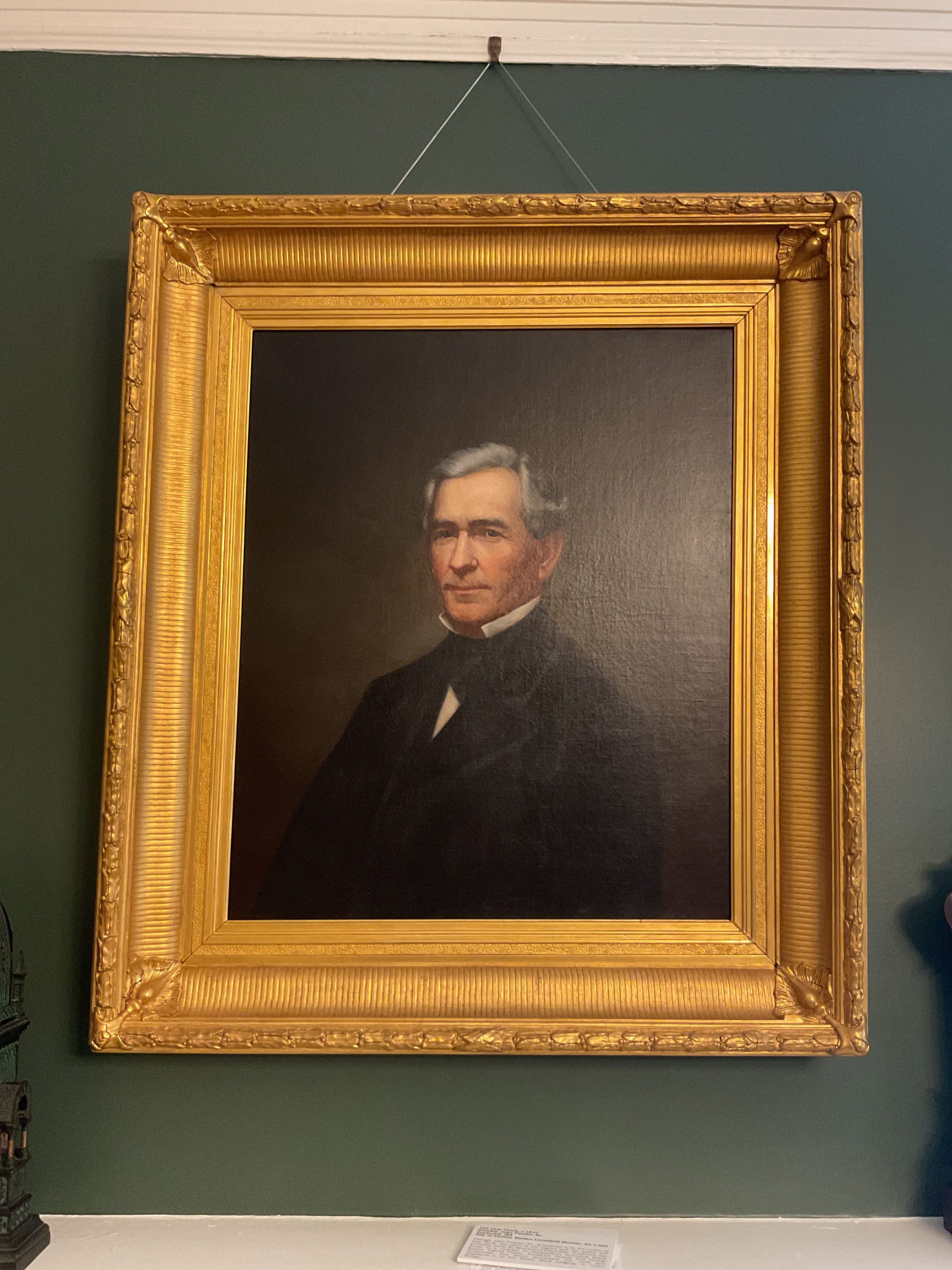 Painting, oil. Portrait of John Longwell on a simple grey background in a large ornate gold frame.