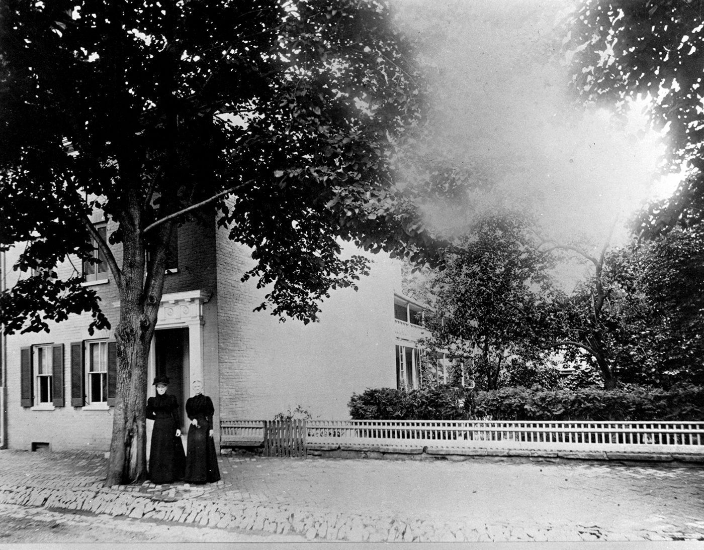 Print, photographic. B/W silver gelatin print, 6" x 8", of the exterior of Judge Maulsby's residence at 133 E. Main St., Westminster. Standing in the yard are Mrs. ___ Crout and Mrs. Maulsby. Written in pencil on reverse is "the Col. Maulsby residence 133 E. Main St. Westminster (next to Davis Library).Acquisition