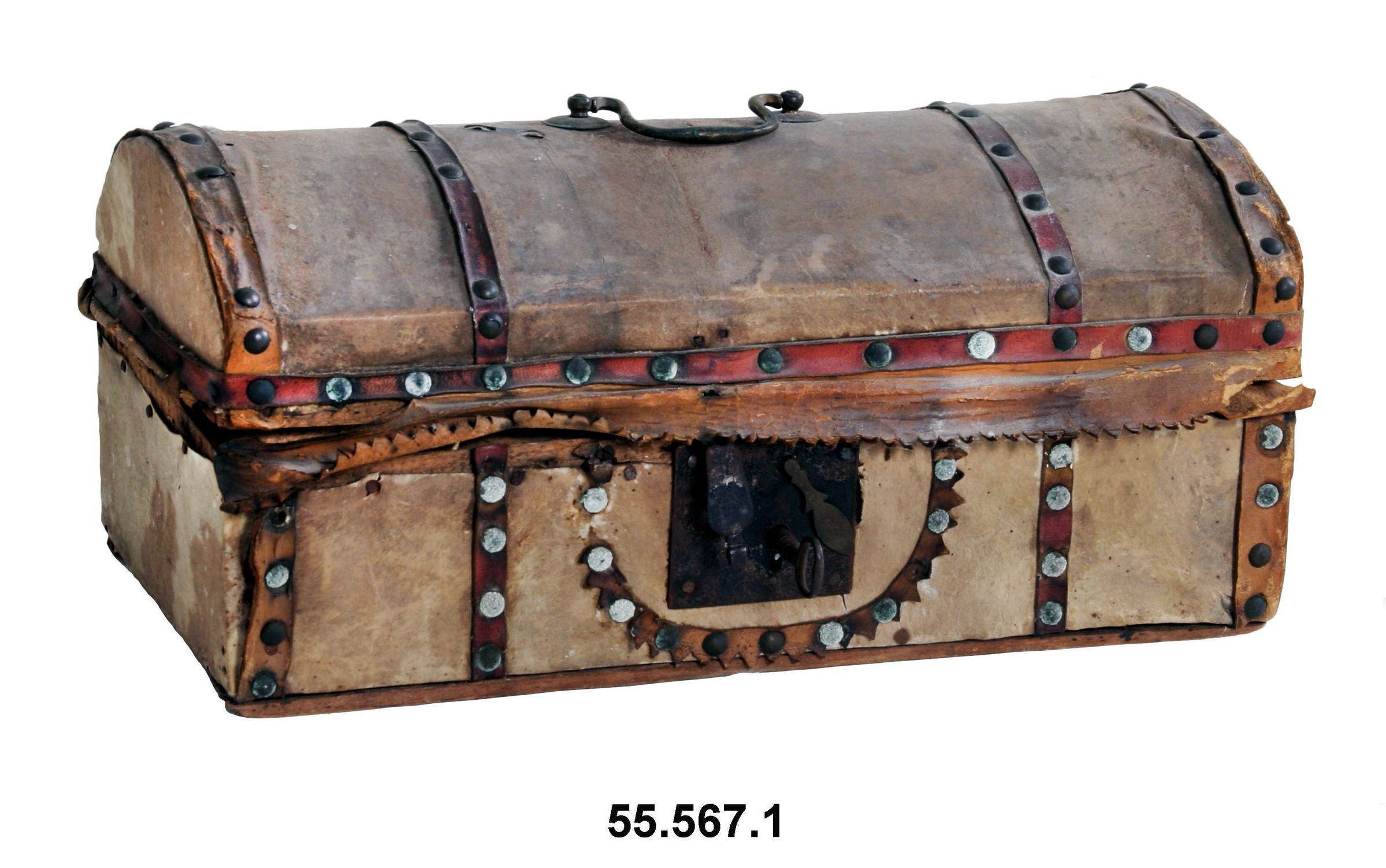 Kit, medicine. Belonged to Dr. Francis J. Crawford. Rectangular box, domed hinged lid. Wood, covered in hide with strips of red leather held on with round tacks, notched trim along front edge. C-shaped metal handle on top of lid.Lined with newspaper. 7"h x 15"w x 8.5"d.Acquisition
