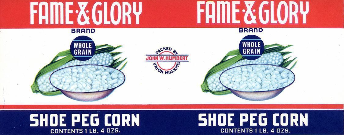 Label. Unused. Fame and Glory Brand, Shoe Peg Corn, John W. Humbert Cannery, Union Mills, Md. C. 1920. Lithographer unknown. 4.25" x 11"Acquisition