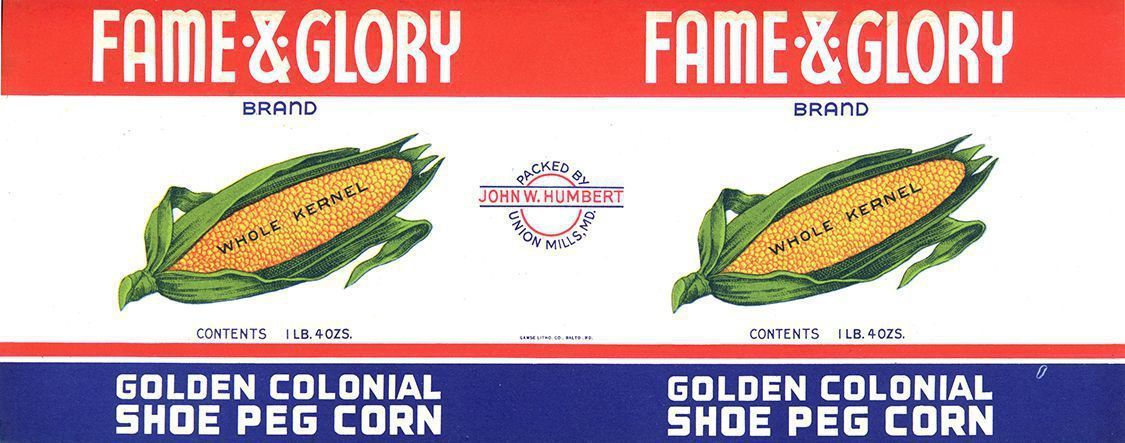 Label. Unused. Fame & Glory Brand, Golden Colonial Shoe Peg Corn, John W. Humbert Cannery, Union Mills, Md. Lithographed by Gamse Litho. Co., Baltimore, Md. C. 1920. 4.25" x 11"Acquisition