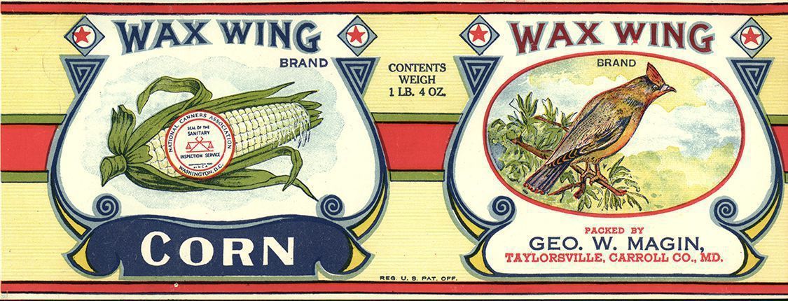 Label. "Wax Wing Brand Corn", depiction of corn and bird on label, white printed paper in red, blue, green, and yellow, 11.25" x 4.25", George W. Magin, Taylorsville, Carroll Co. MD, c.1950.Acquisition