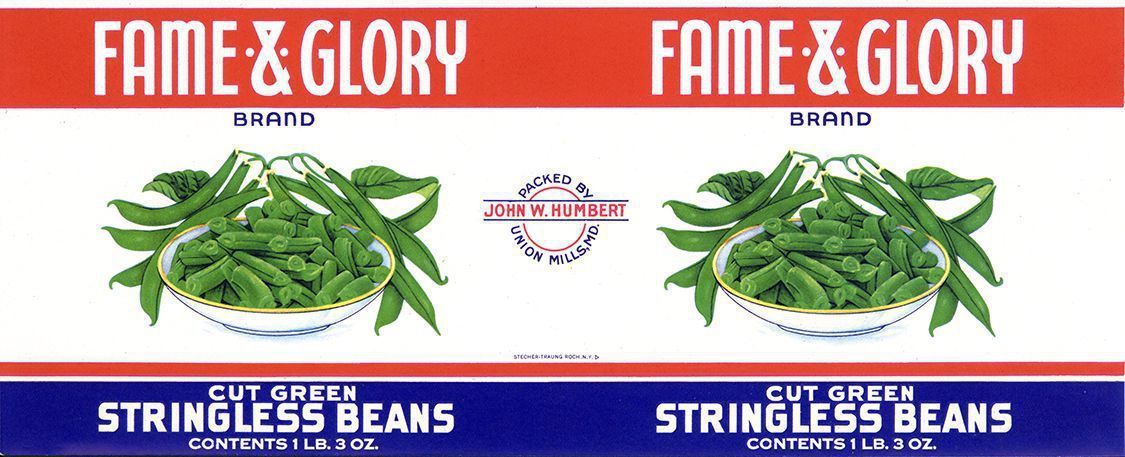 Label. Unused. Fame & Glory Brand, Cut Green Stringless Beans, John W. Humbert Cannery, Union Mills, Md. Lithographed by Stecher-Traung, Rochester, NY. C. 1920. 4.25" x 11"Acquisition