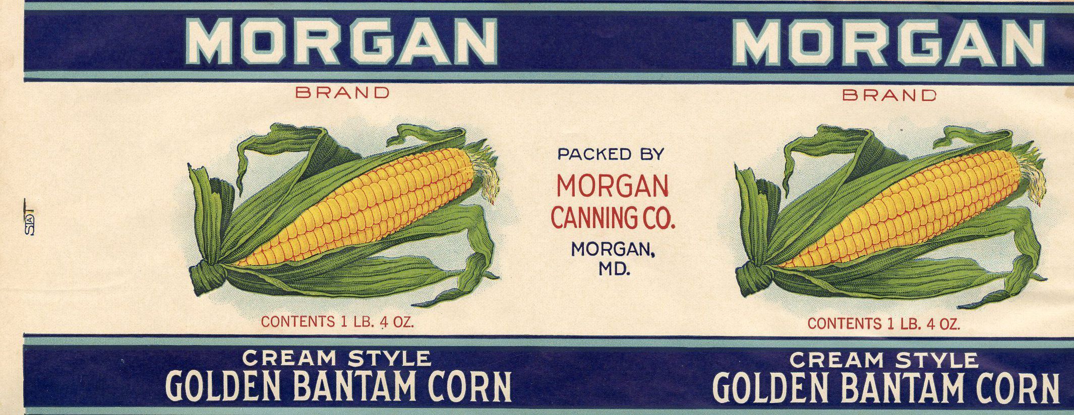 Label. Can, 4.25" x 11", "Morgan Brand Cream Style Golden Bantam Corn, white paper label with blue, green red and yellow printing. Morgan Canning Co., Morgan, Md. C. 1950.Acquisition