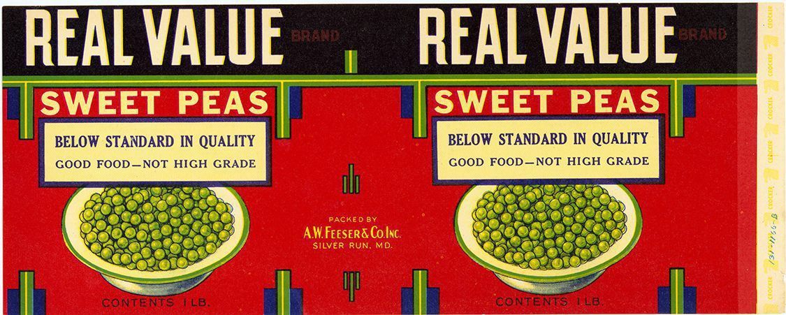 Label. "REAL VALUE SWEET PEAS". " A.W. FEESER & CO., INC., SILVER RUN, MD." "BELOW STANDARD IN QUALITY GOOD FOOD - NOT HIGH GRADE". Band of black across top has white lettering; remainder of label is red with white, yellow and blue lettering and two drawings of bowls of peas. For 1 pound can. Marked "Crocker" along proper left edge. 4.125" x 10.25".Acquisition