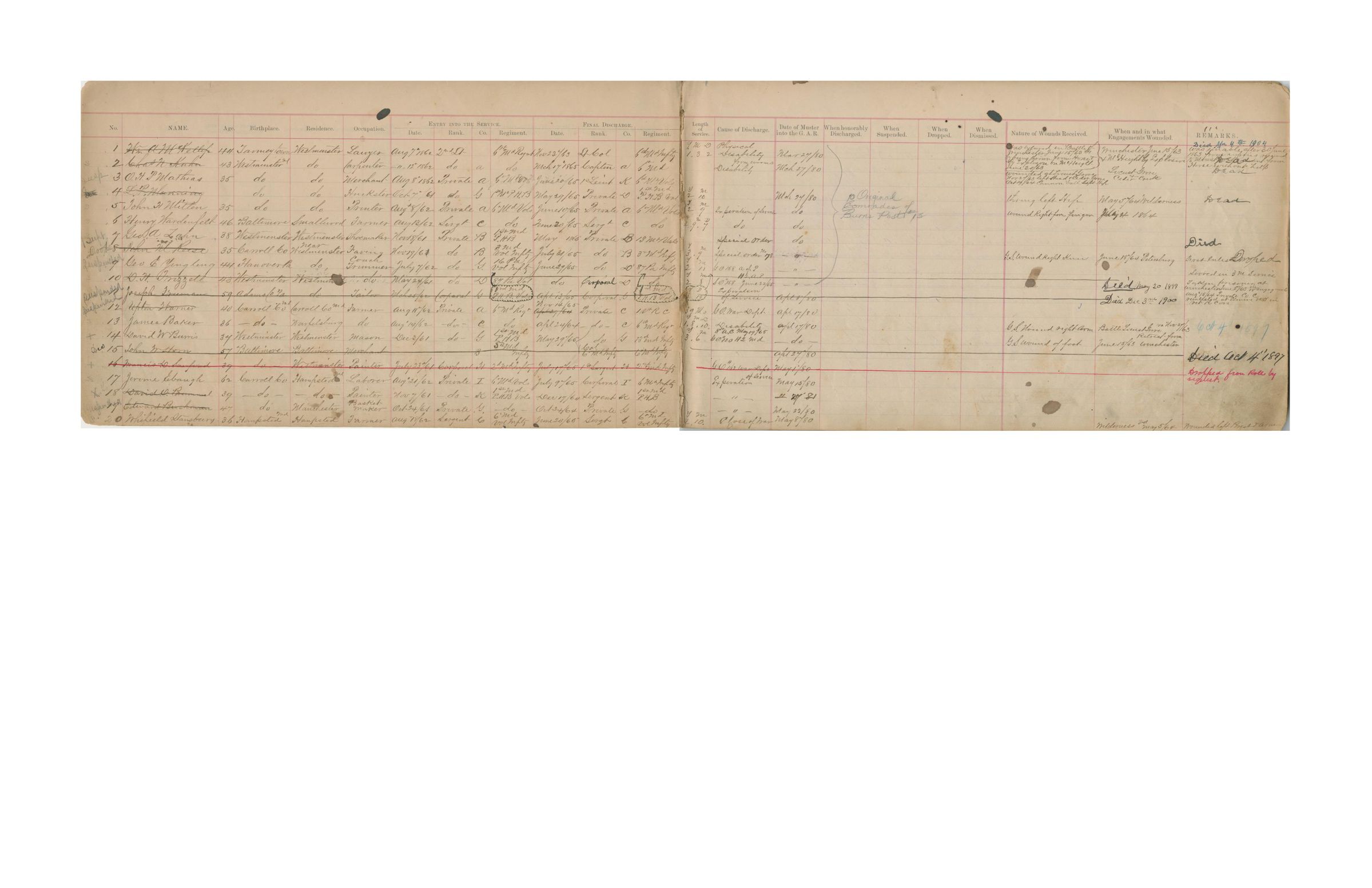 Ledger. Burns Post No. 13, Grand Army of the Republic - Membership Listing. Contain 136 names of members of Burns Post. Columns for full name, age, birthplace, residence, occupation, date of entry into service, rank, company, regiment, date of final discharge, rank, company and regiment, length of service, cause of discharge, date of muster into G.A.R., when honorably discharged, when suspended, when dropped, when dismissed, nature of wounds received, when and in what engagements wounded, remarks. Death often recorded in "Remarks" column. Book appears to be printed for G.A.R. purposes. Covers period from establishment of Burns Post in 1880 until last member joined in 1914. Not all pages of book filled. Cover: Cardboard with marbling in brown and red tones. Plate on front cover identifies - "Descriptive(?) Book - Burns Post No. 13, Department of Maryland, G.A.R." Also seal of G.A.R., Headquarters Department of Maryland, 114 North Paca Street, Baltimore, MD. Dimensions: 8" x 14" x .375".Acquisition