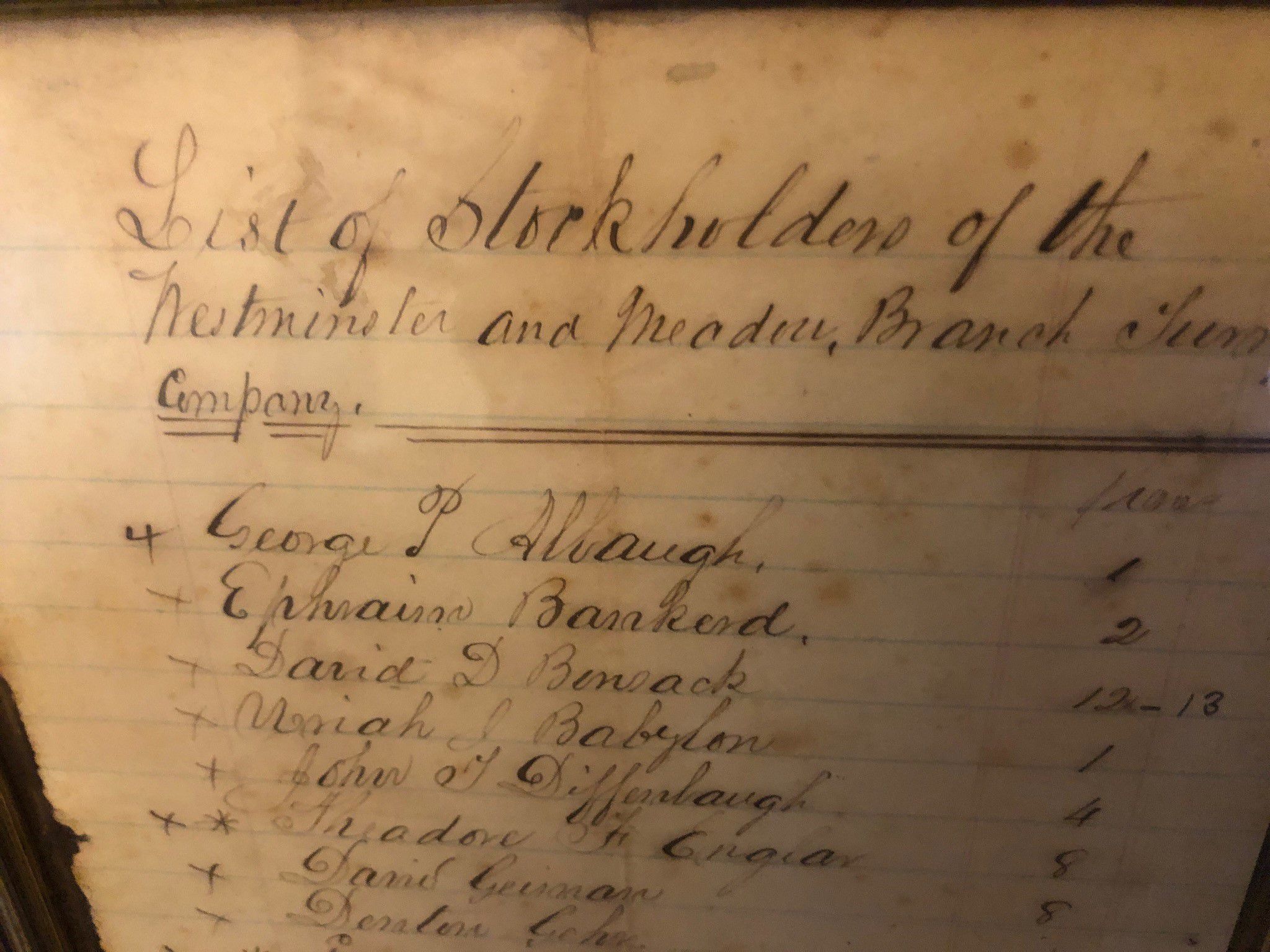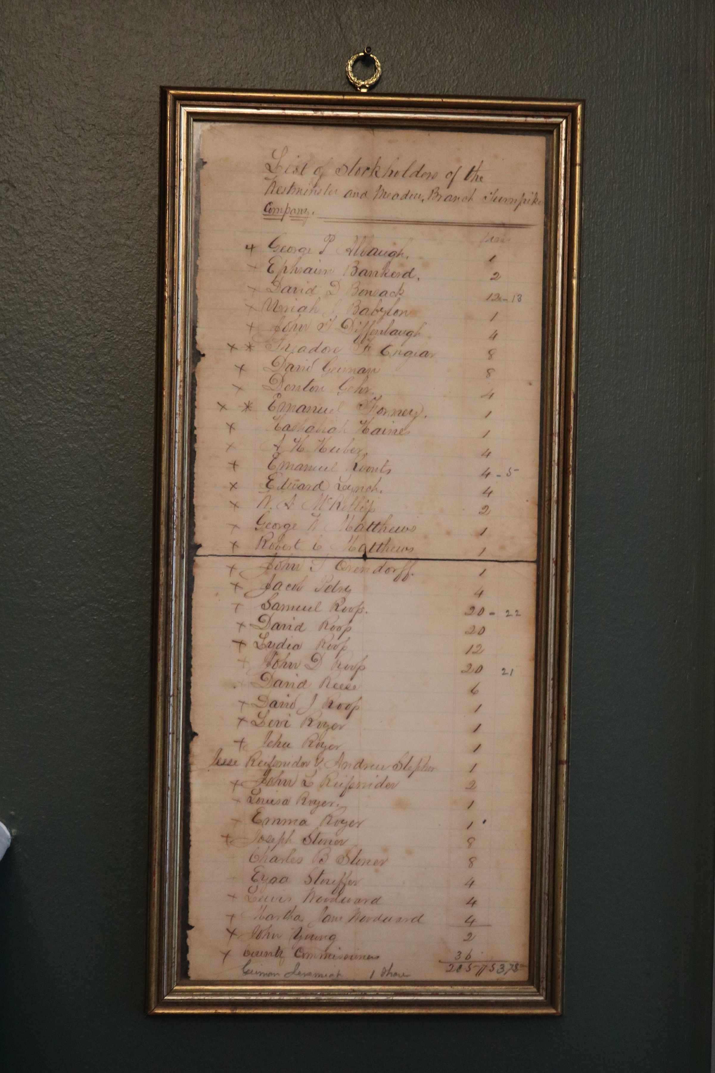 List of Stockholders of the Westminster and Meadow Branch Turnpike