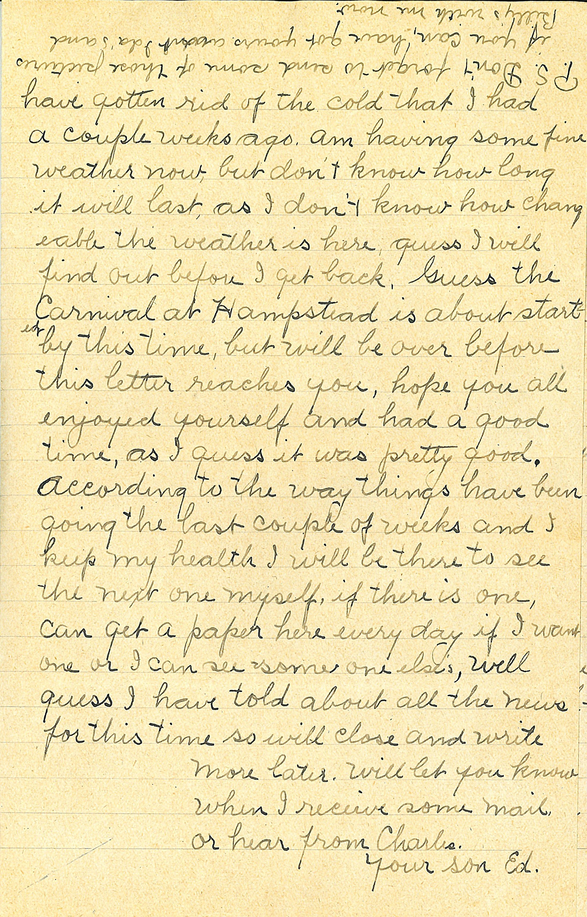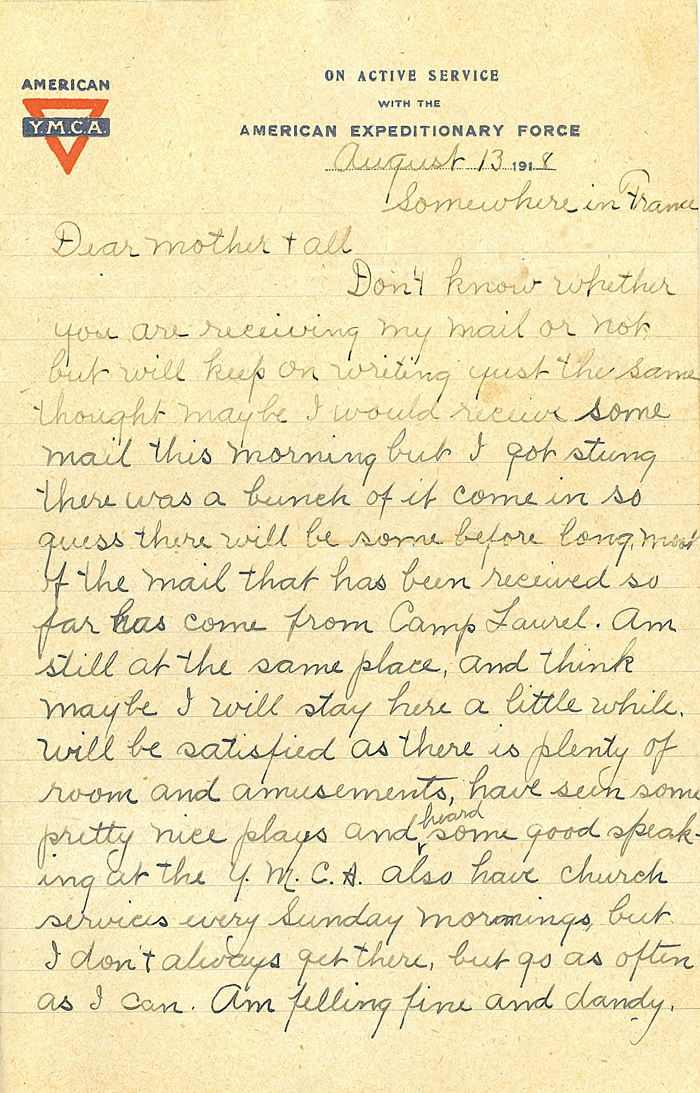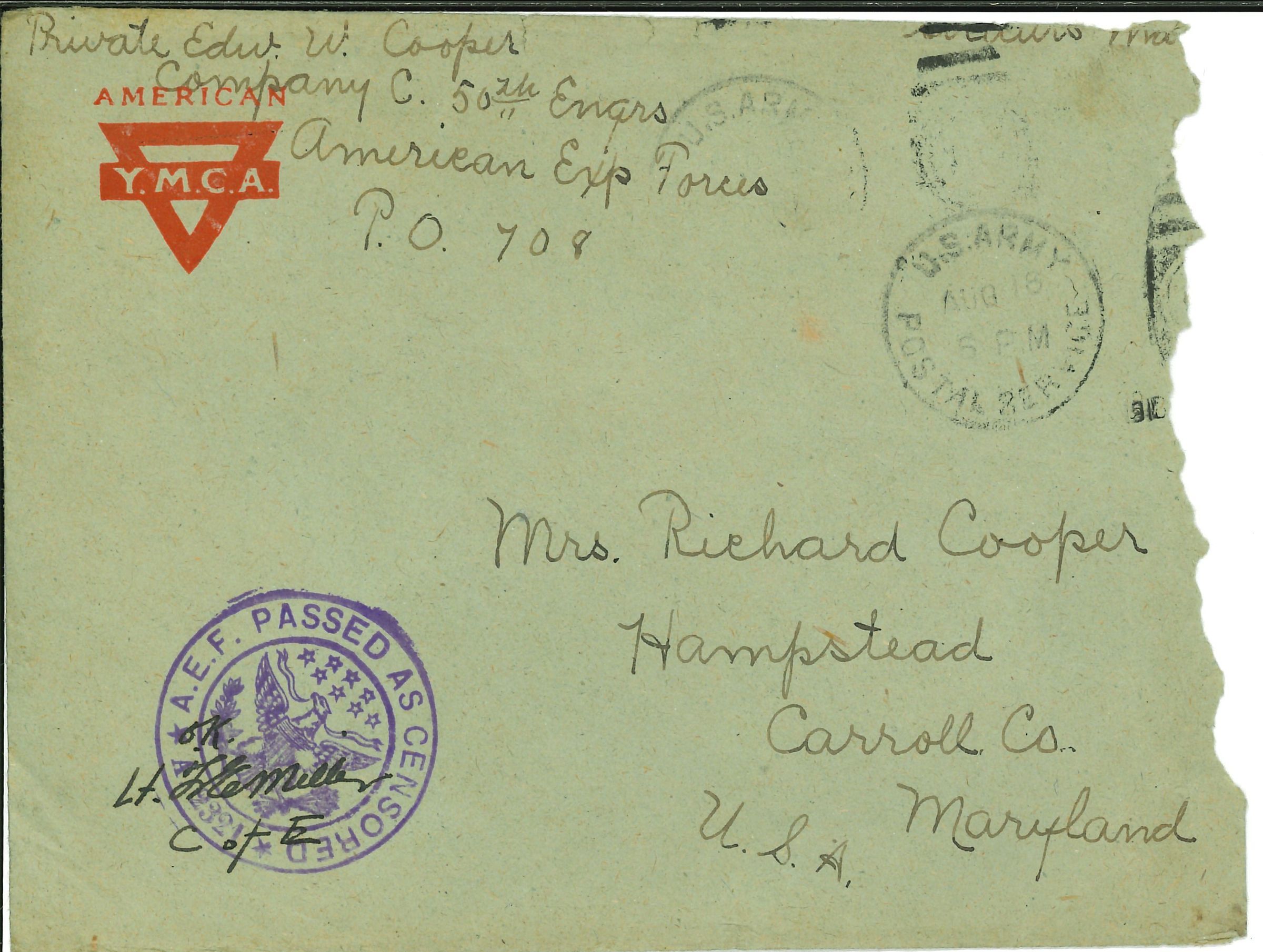 Letter. Pvt. Edgar Wells Cooper, Co. C, 50 Engineers, AEF to Mrs. Richard Cooper, "Somewhere in France." 13 August 1918; with envelope.Acquisition