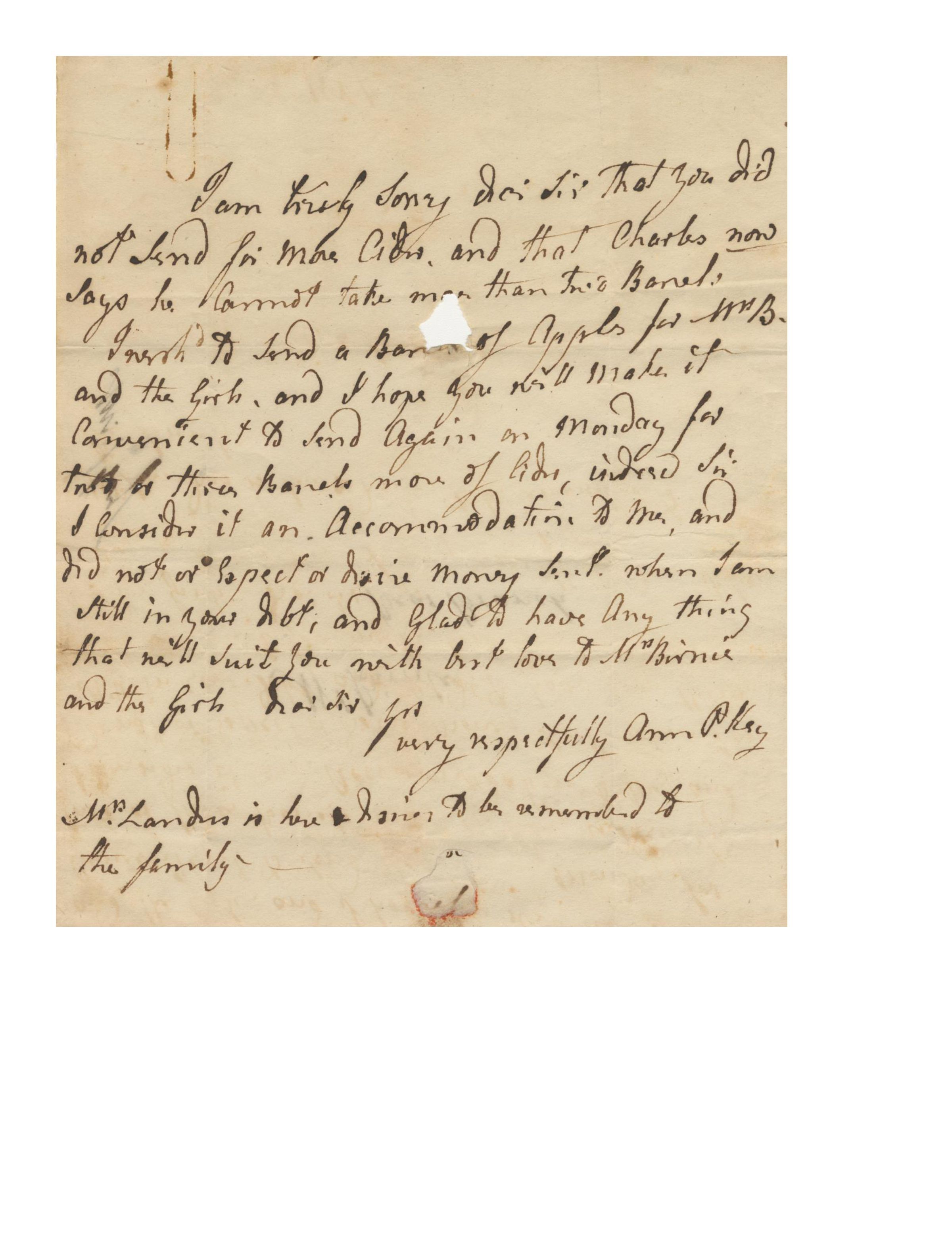 Letter. Addressed to Mr. Birnie, Bear Branch, from Ann P. Key. Not dated; probably early 19th century. Discusses sending barrels of apples to be made into cider. 8" x 6.5"Acquisition