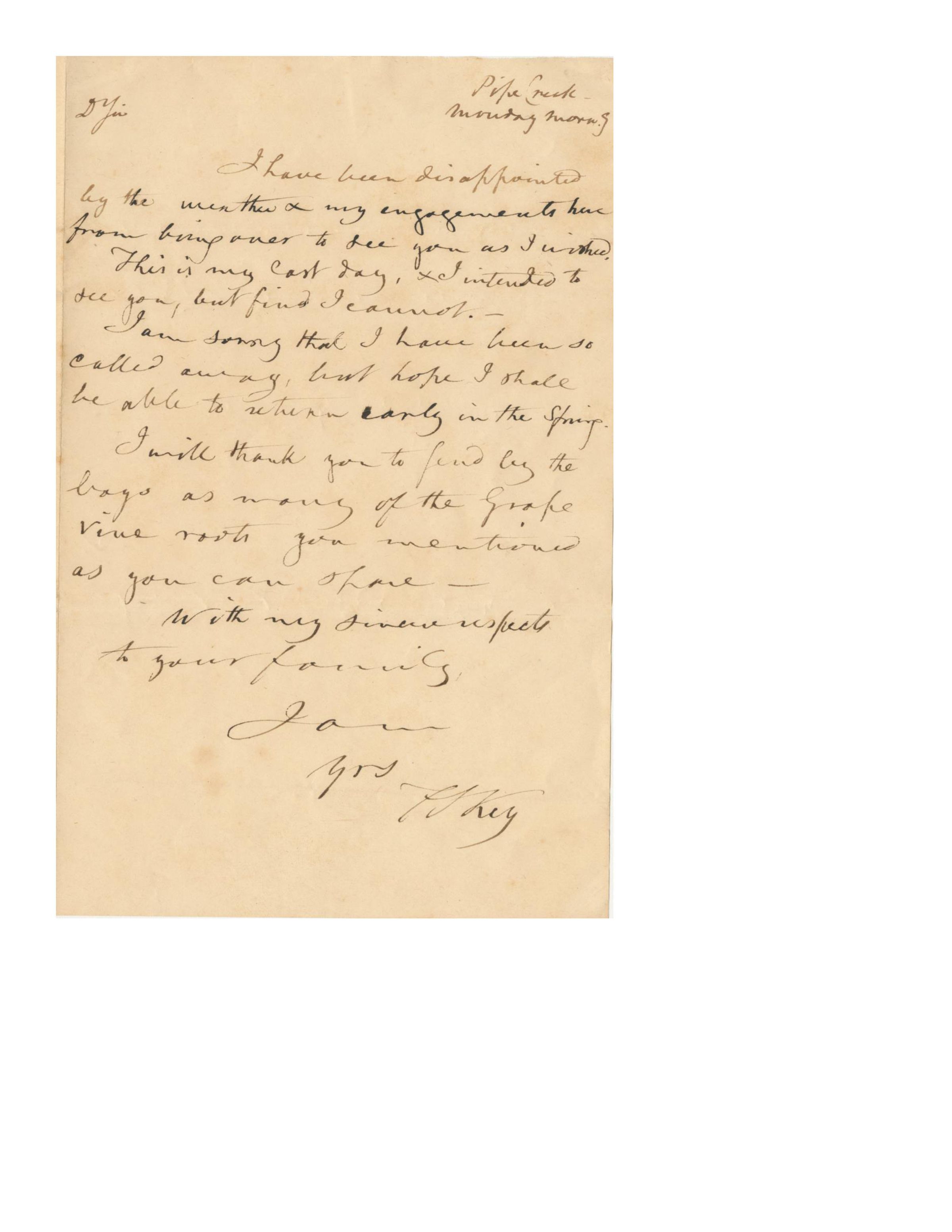 Letter. Addressed to Mr. Birnie, Thorndale, from F.S. Key, Pipe Creek. Dated Nov.; probably 1841. Key is apologizing for not having the time to visit Birnie. Name on address side of letter is Francis S. Key 7.625" x 9.875"Acquisition