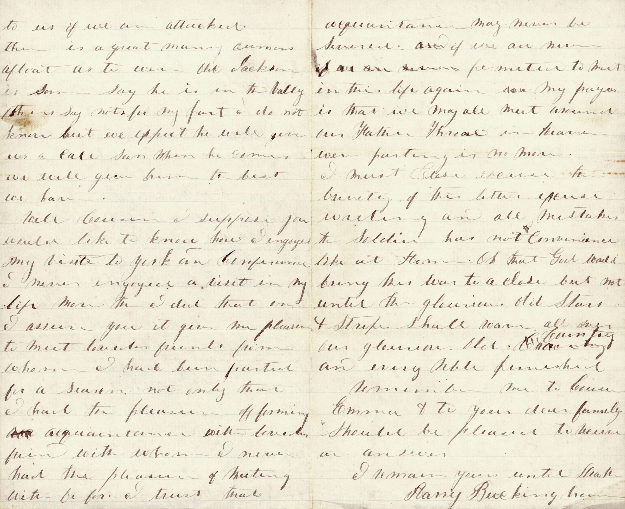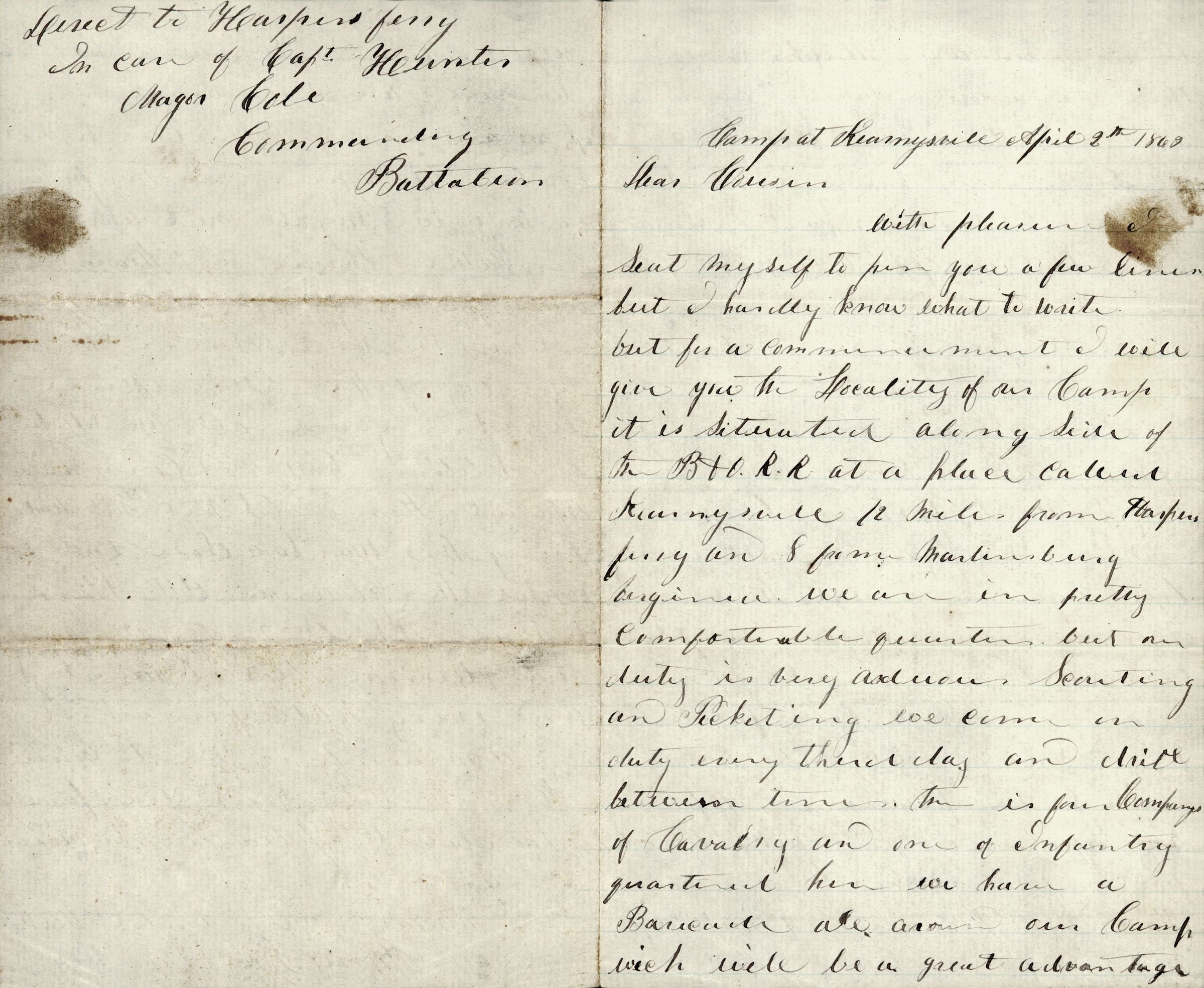 Letter. ALS, Harry Buckingham to "Dear Cousin," Kearnysville, MD, April 2, 1862Acquisition