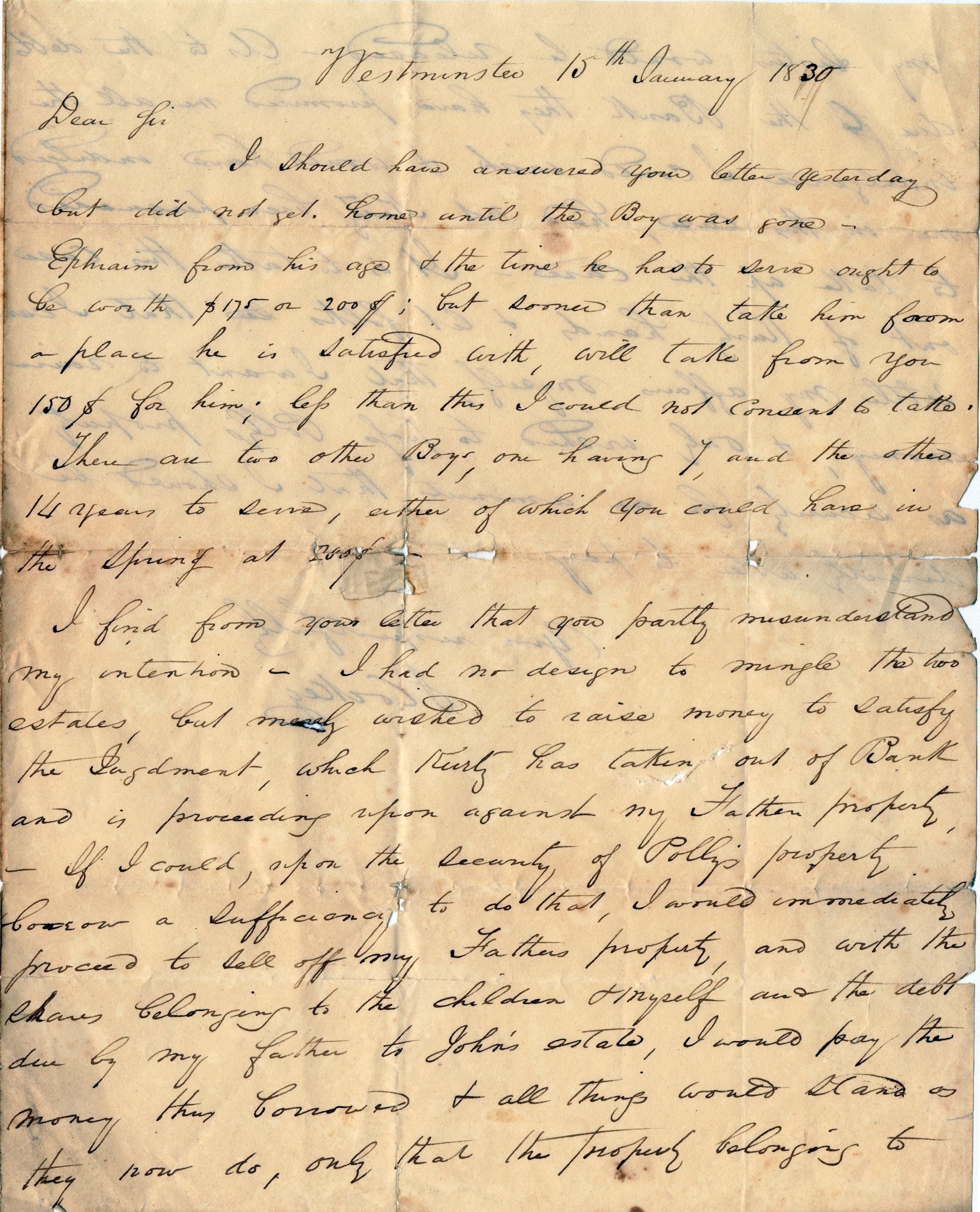 Letter. To Col. Jacob Shriver from Joshua Cockey, refers to sale of slaves and property, Jan. 15, 1830. Handwritten, 10"x 8".General Notes