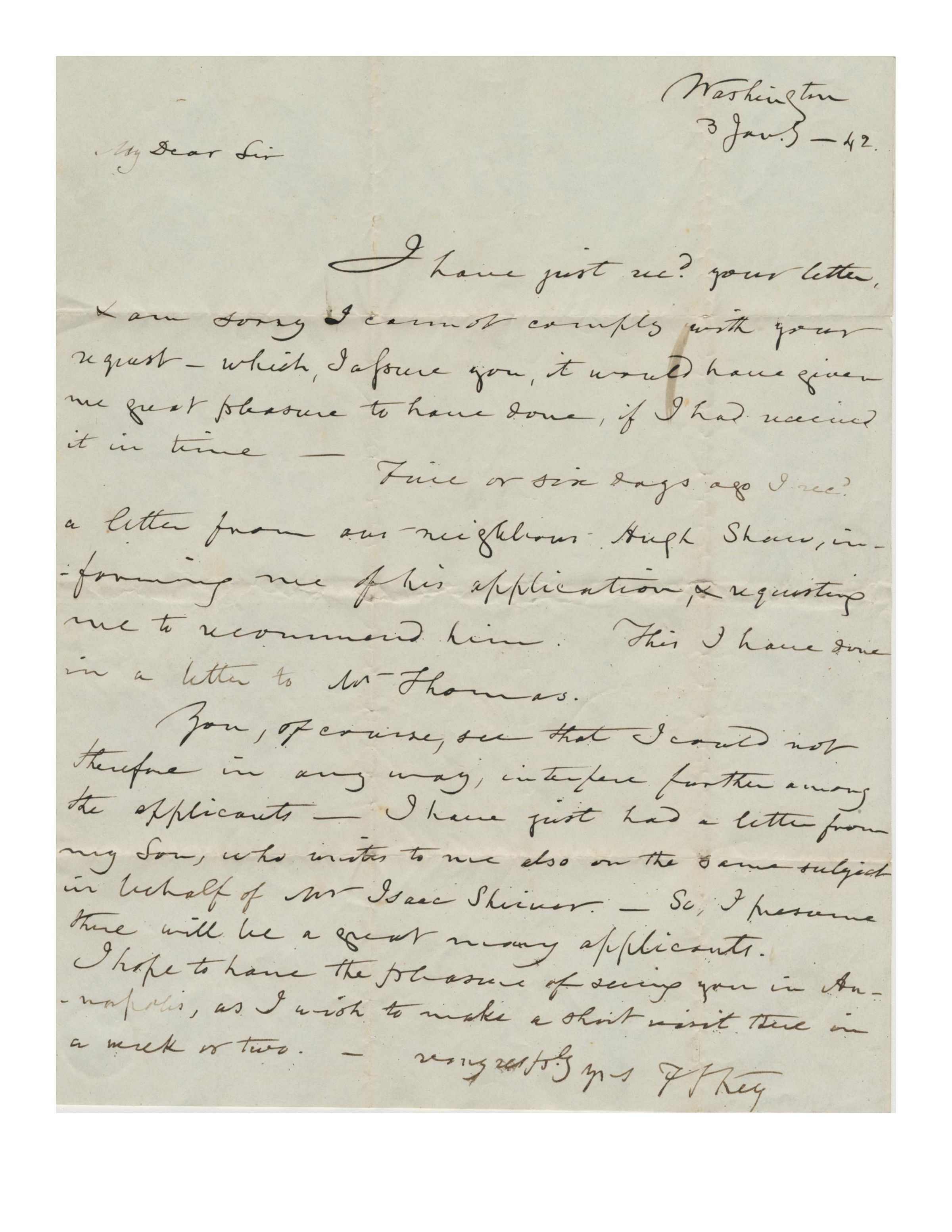 Letter. Written by Francis Scott Key, Washington, 3 January 1842, to Jn B.[rooke] Boyle, House of Delegates, Annapolis. 10.375" x 16.5" sheet, folded in half to form 10.375" x 8.25" booklet. Letter written on front only; folded again for mailing with address written on reverse. Postmarked WASHINGTON CITY JAN 3. Key is replying to a request from Boyle to assist with appointing an unnamed person to a government position; Key would have helped had he received the request sooner.Acquisition