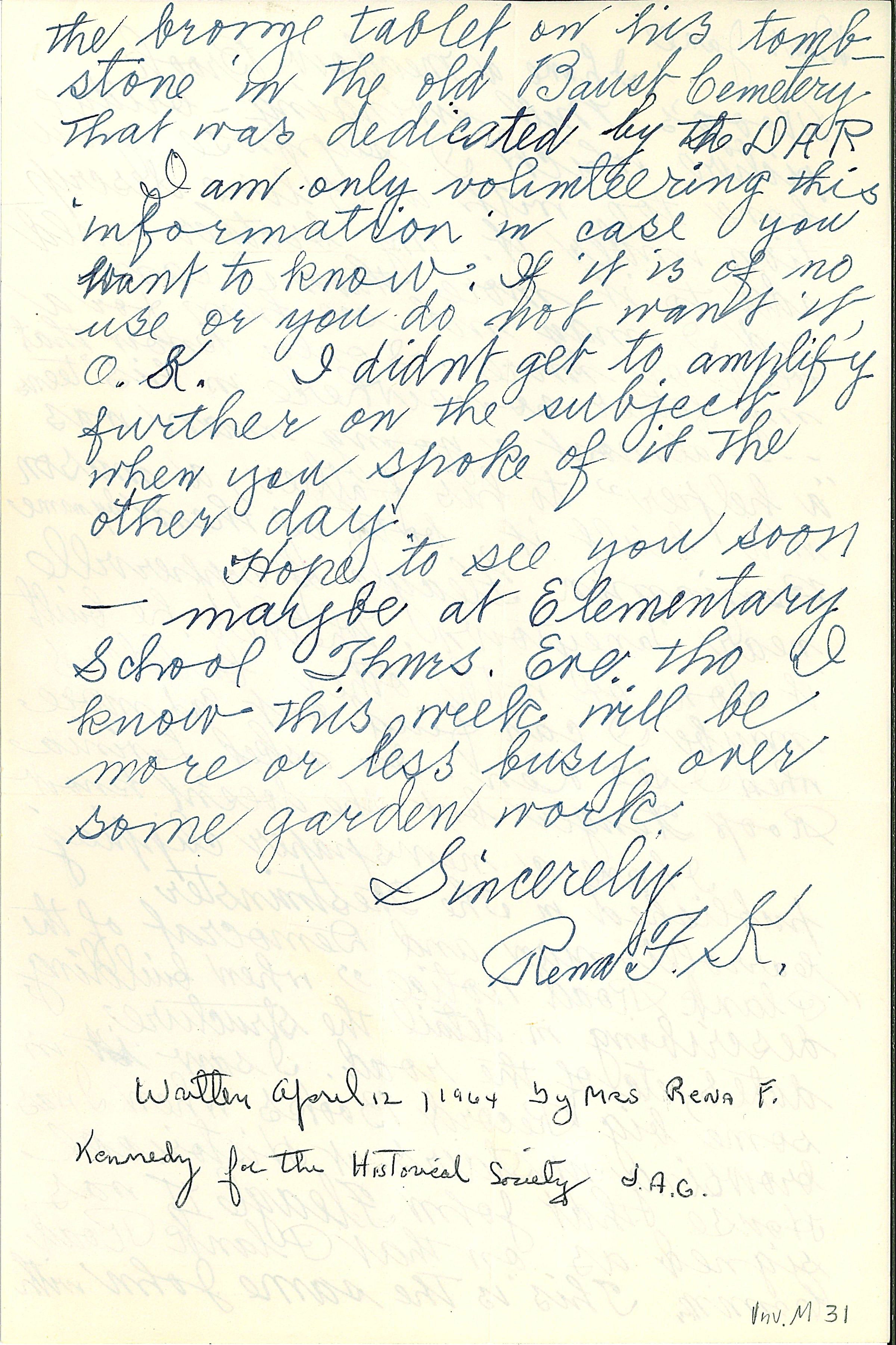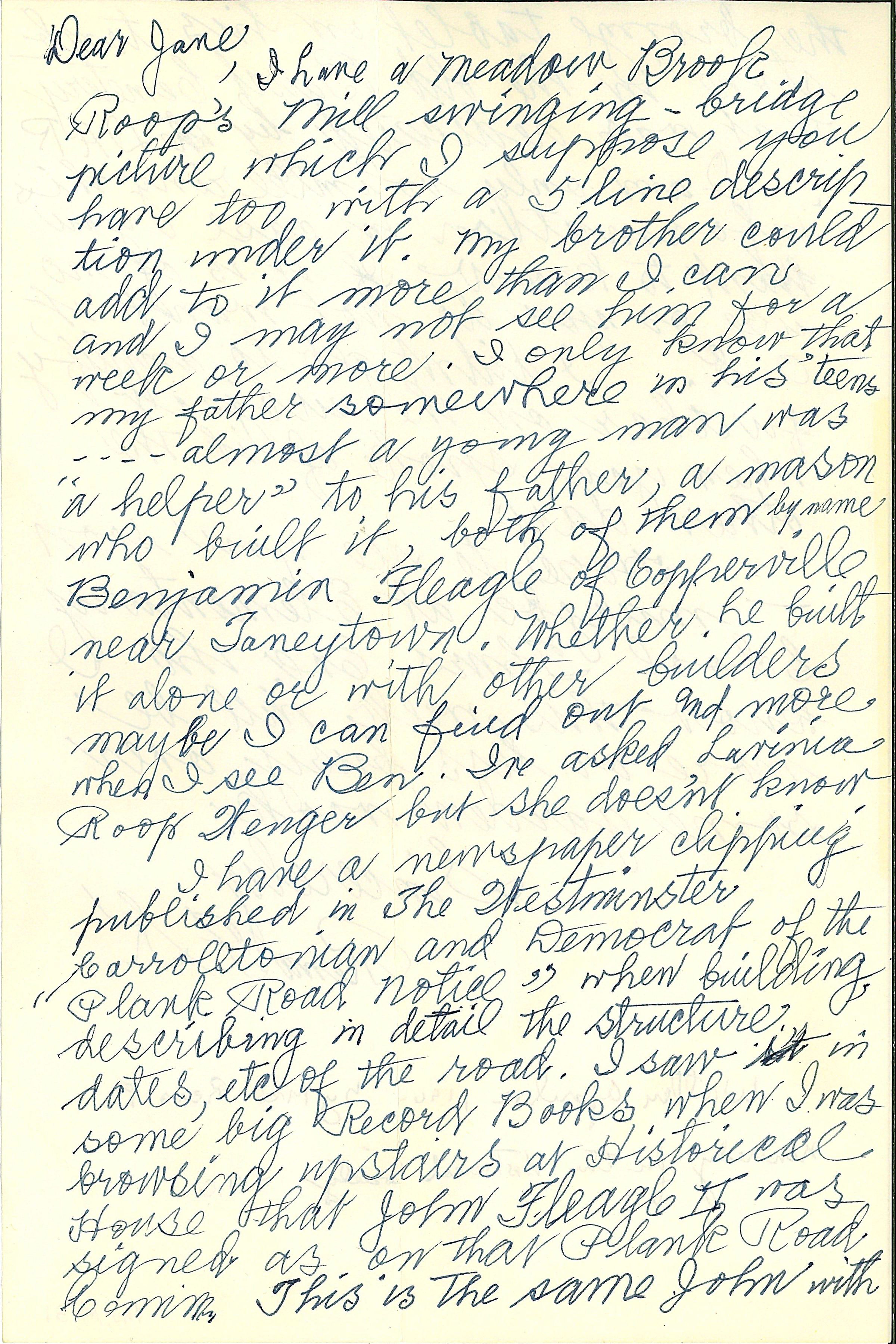 Letter. From Rena F. Kennedy to Jane, April 12, 1964. Refers to swinging bridge at Roop's Mill. One 7" x 5" handwritten sheet with envelope.