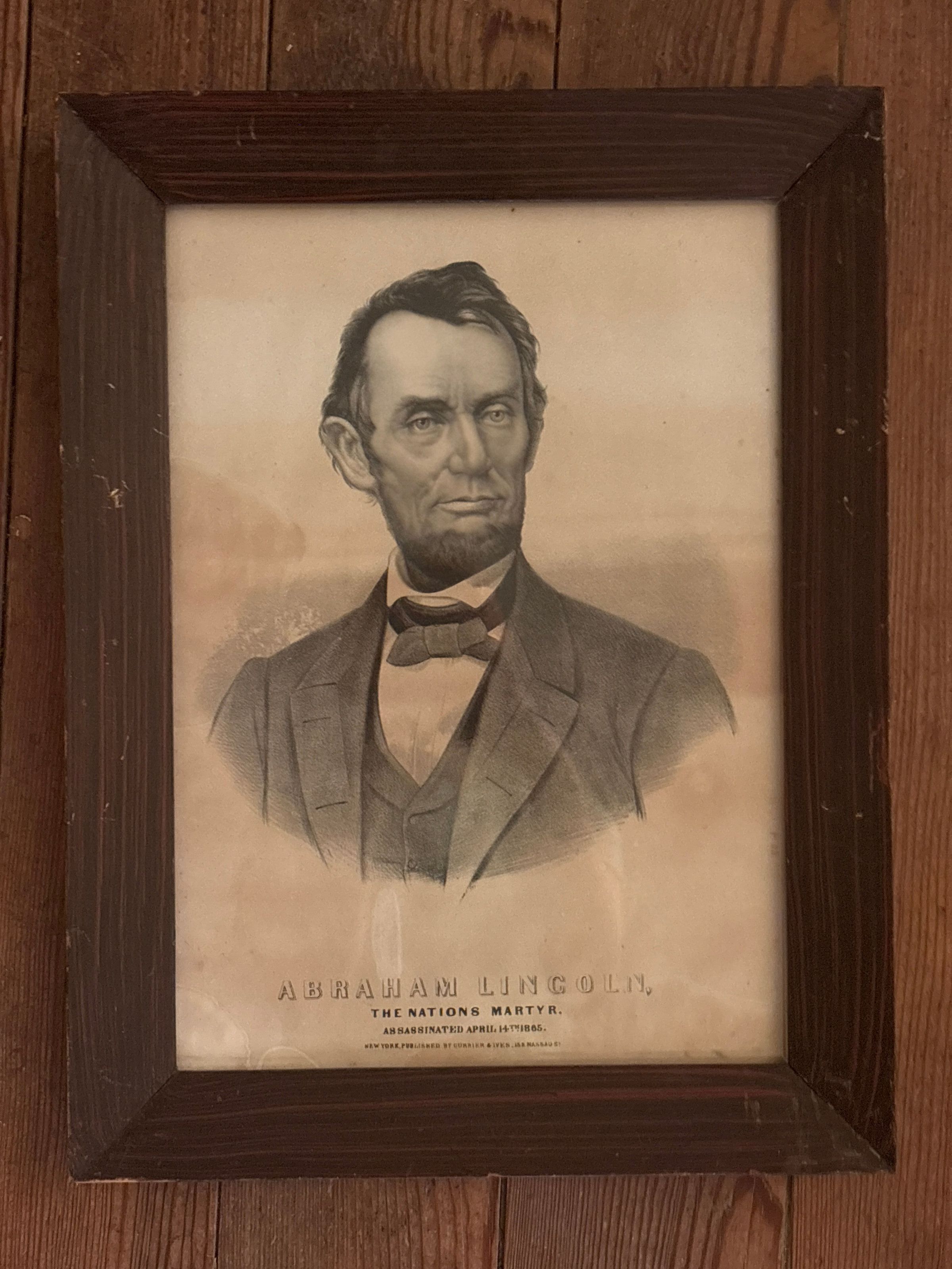Print. Black/white image of Abraham Lincoln. Caption reads "ABRAHAM LINCOLN THE NATIONS MARTYR. ASSASSINATED APRIL 14th, 1865 NEW YORK, PUBLISHED BY CURRIER & IVES, 158 NASSAU ST." Rectangular, wood frame. 16.75"h x 12.75"w x 1"d.Acquisition