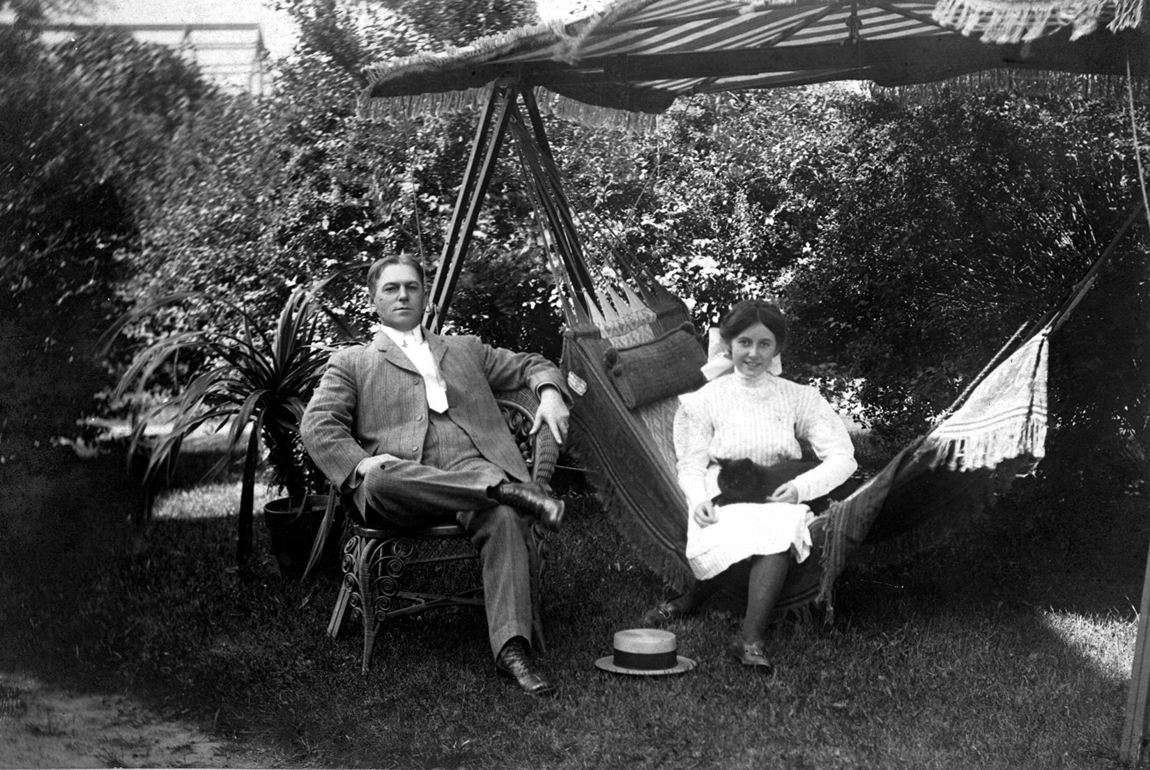 Print, photographic. B/W photo of Fred Littlefield and his daughter, Thelma Walden Littlefield [Shriner]. Taken outdoors, probably at Bowling Brook. Fred is seated on a wicker chair; Thelma is next to him, sitting on a hammock. Mounted on heavy textured cream-colored paper. Written on back in pencil: "Fred Littlefield Thelma Littlefield". 4.125" x 6.125". C.1910.Acquisition