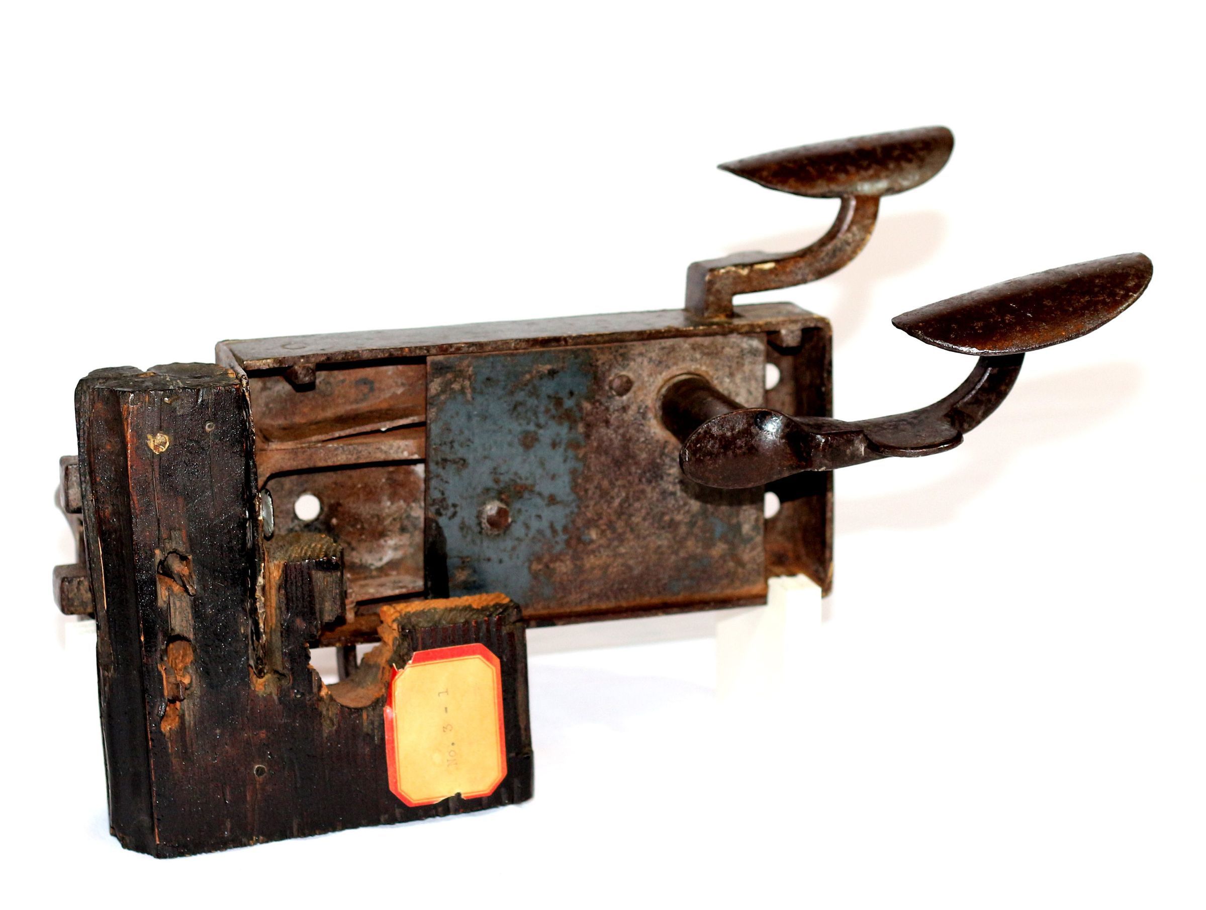 Lock from the Adam Good Tavern in Taneytown, Carroll County, Maryland. C. 1760-1790. Steel plate with two latches at one end. Two bars extend out from other end. Small L-shaped piece of the door is still attached. 7.5"h x 8.5" w x 8"d.Acquisition