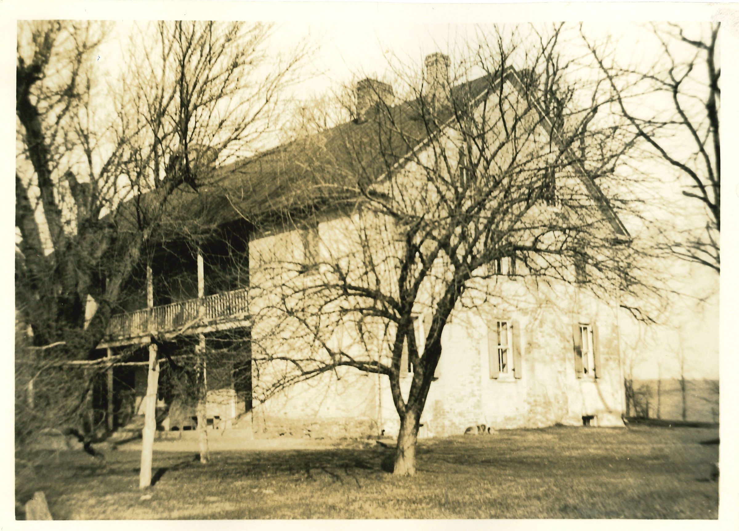 Black and white photograph of the Long Farm in Westminster. The photograph shows a large white two story brick house with a recessed porch in the proper left portion on the photograph. Trees stand in front of the house as does a clothesline. The photograph is mounted on white paper and has a typed inscription underneath. The photograph measures 5.00"x 7.00".