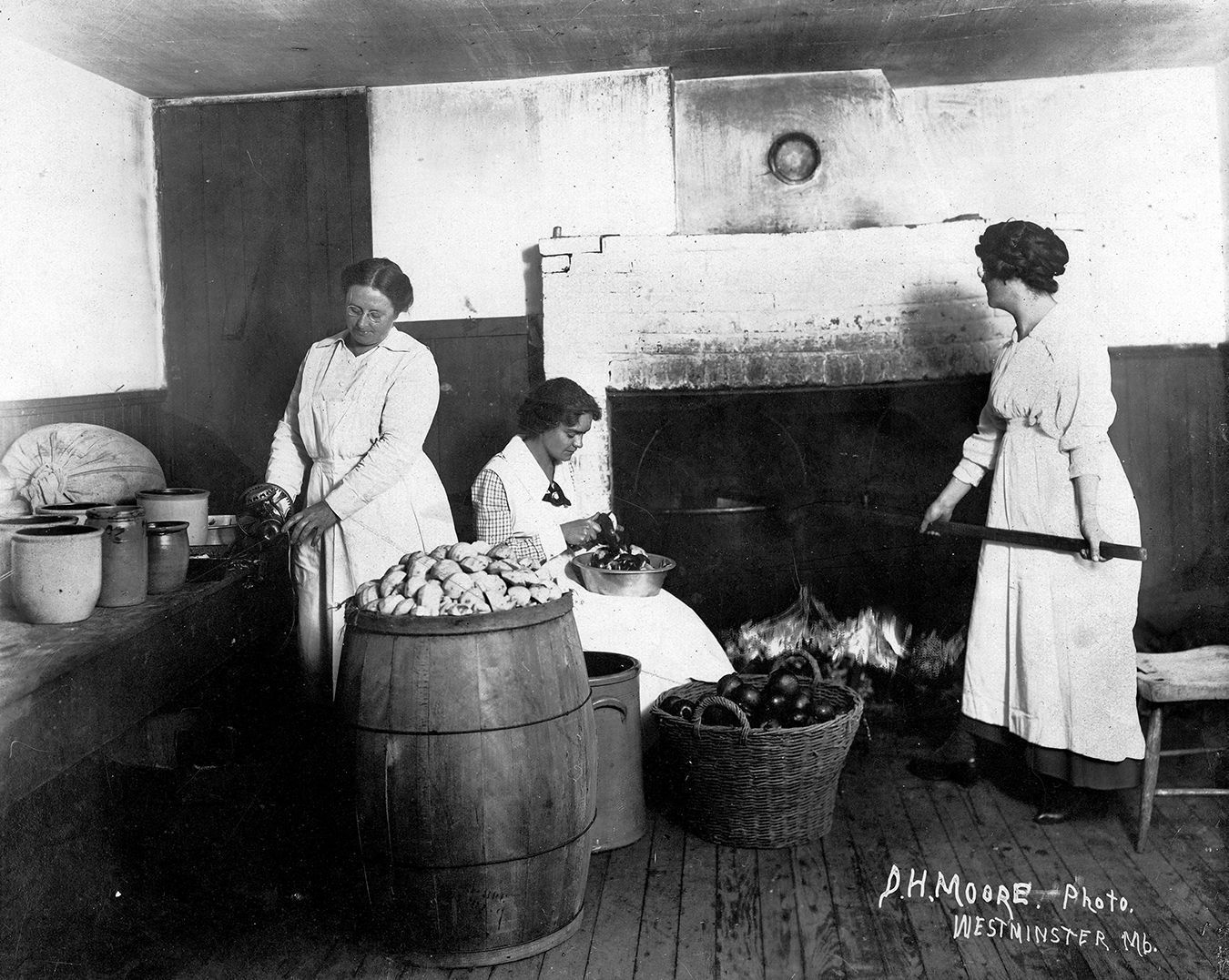 Print, photographic. B/W photograph of three women in a kitchen making apple butter in the wash house at "Long Farm" near Westminster. May Bish, unidentified, Harriet Gist. The maker's mark is written directly on the photograph, "D.H. Moore Photo Westminster, MD". Mounted on a gray mat board. Inscription on the the front of the mat board reads, "May- Making Apple Board- Harriet". The inscription of the back reads, [?] at the Old Gist House".Overall measurement 12" x 14"; image size 8.25" x 10.25". C. 1910.Acquisition