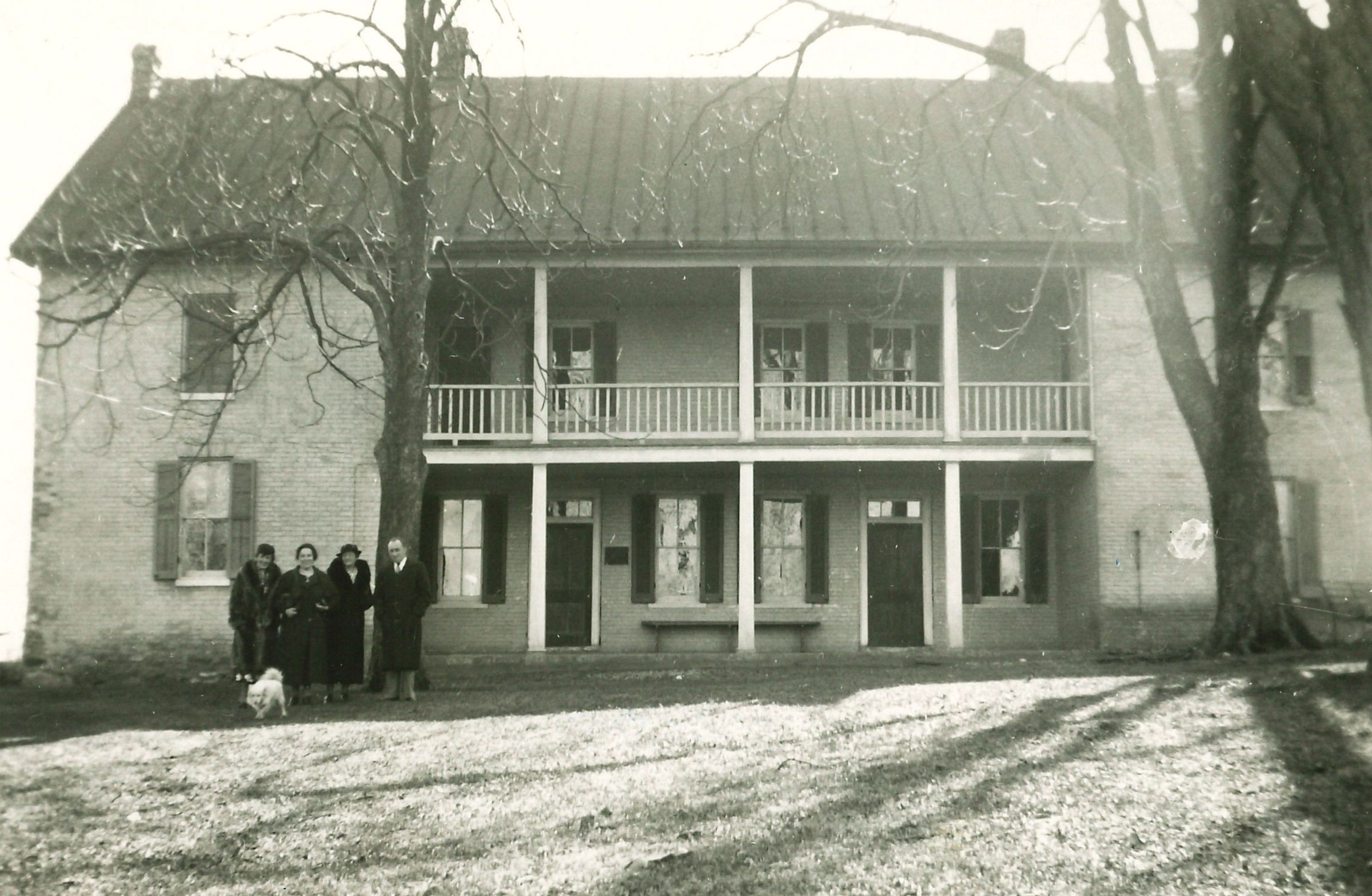 Print, photographic. B/W photograph of Long Farm (Gist house) in Westminster.The photograph shows the front façade of the house with its recessed porch and two doors on the ground level. A group of people stands on the lawn: three woman, a man and a dog. Inscription on the back reads, "Mrs. Robert Gist". Photographer unknown. 4" x 6". C. 1940Acquisition