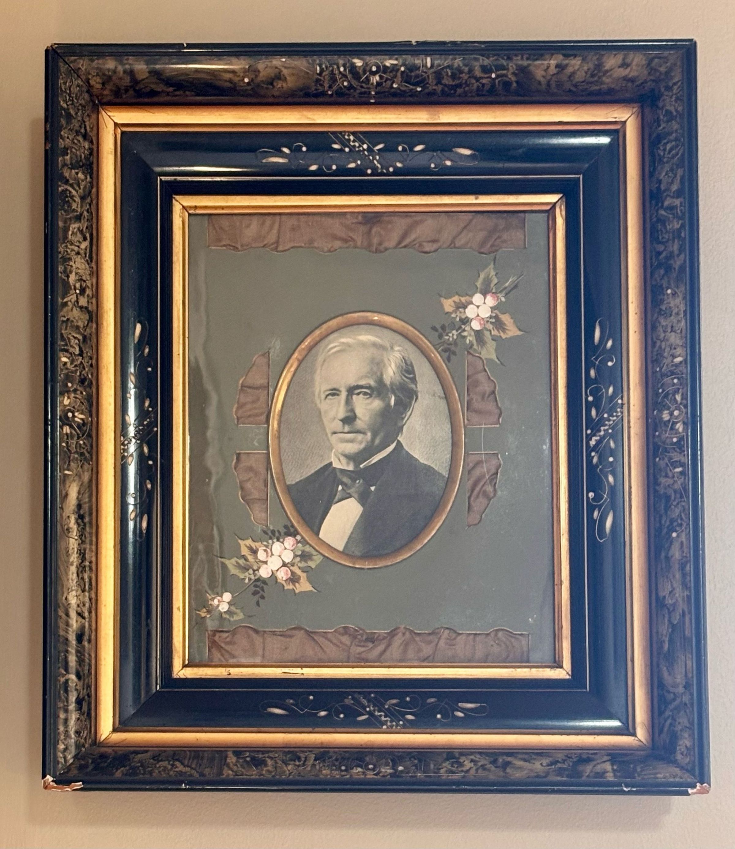 15.5"h x 13.25"w x 2.5"d. Rectangular wood frame, green marble-like inlay, brass trim, carved designs. Mat is gray with brown silk showing through, handpainted floral designs. Black/white image of man.General Notes
