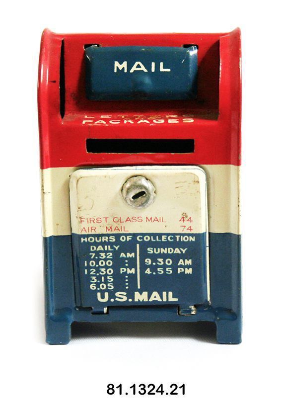 Mailbox. Toy. 2.75"h x 1.75"w x 1.375"d. Metal sidewalk style box, with flap on top and rectangular door with lock on bottom. Red/white/blue striped with "US MAIL" on sides. Front reads: "MAIL LETTERS AND PACKAGES HOURS OF COLLECTION." On bottom: "MADE IN JAPAN."Acquisition
