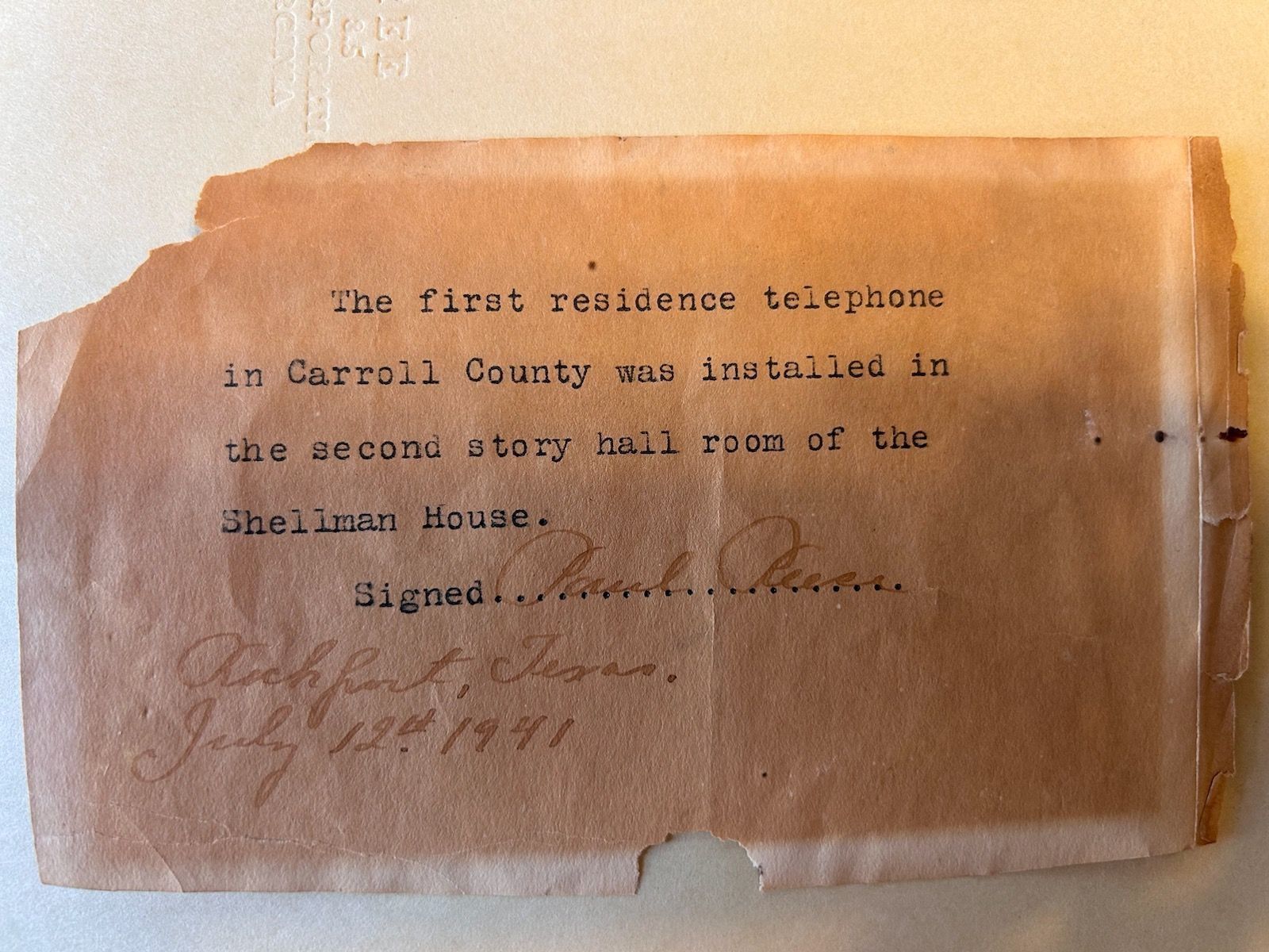 Manuscript. Typed slip of paper stating that first residence telephone in Carroll County was installed in the Shellman House. Signed by Paul Reese. Dated July 12, 1941, Rockport, Texas.Acquisition