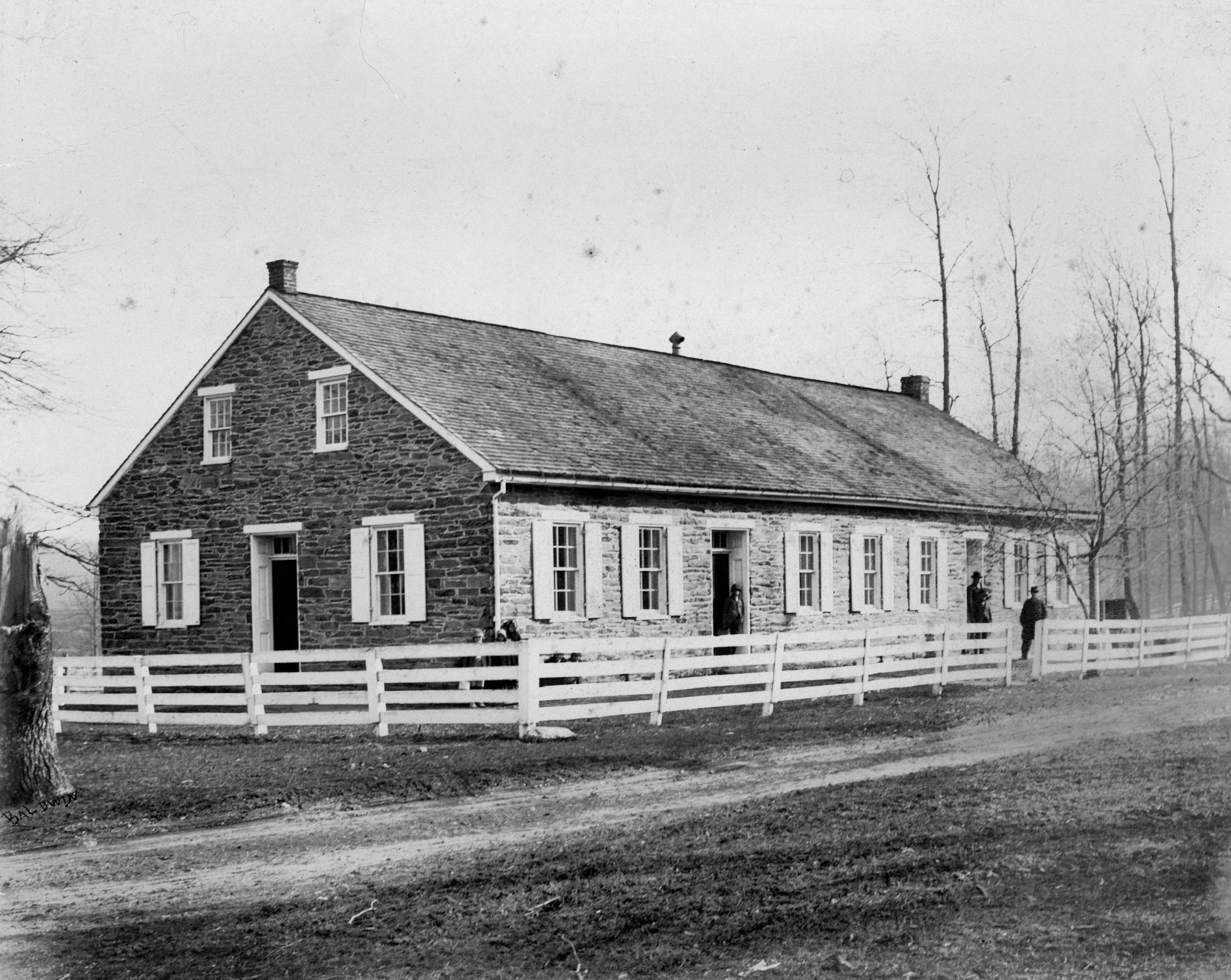 Print, photographic. B/W silver gelatin print mounted on board, 8" x 10". Image measures 7.5" x 9.5"; shows the exterior of the old Meadow Branch Church of the Brethren. Written on back is "old Meadow Branch Church."Acquisition